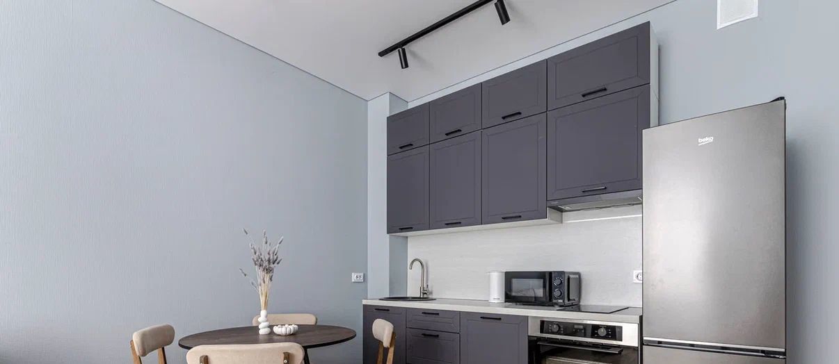 1 зона: кухонный гарнитур со встроенной варочной панелью, посудомоечной машиной, чайником, микроволновкой и вместительным холодильником.