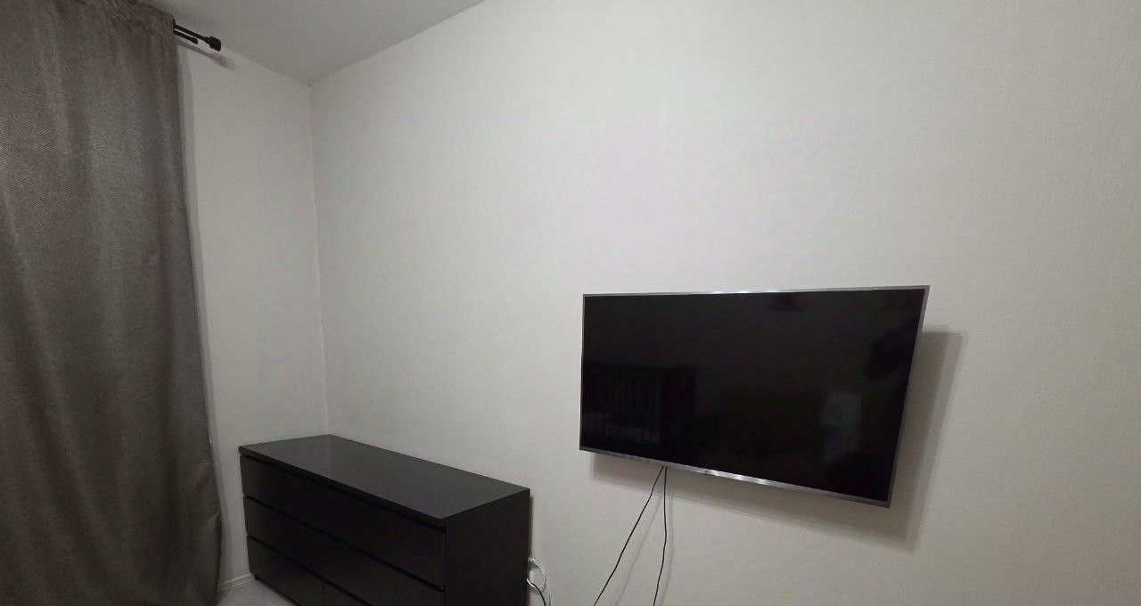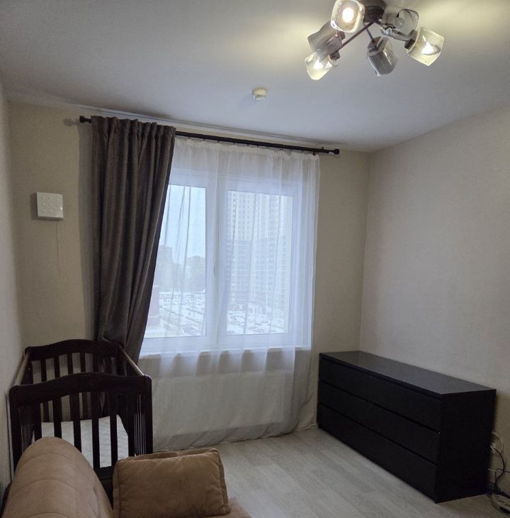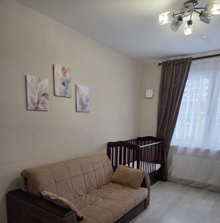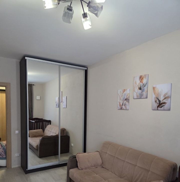 В комнате установлен удобный диван с лёгкой системой разборки для организации двухспального места и вместительный шкаф-купе до потолка, а также детская кроватка с маятниковым механизмом (кроватку можно убрать). На стене телевизор с диагональю 40 дюймов. Из окон открывается приятный вид на парковку и дом с архитектурной подсветкой.