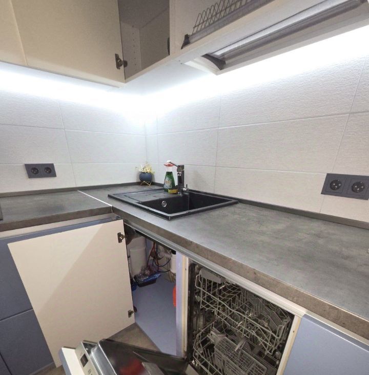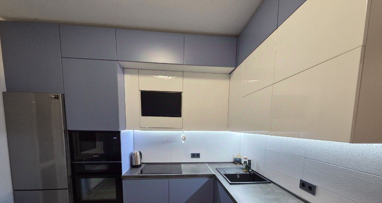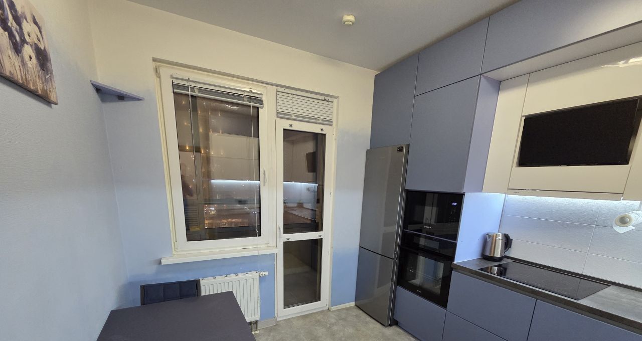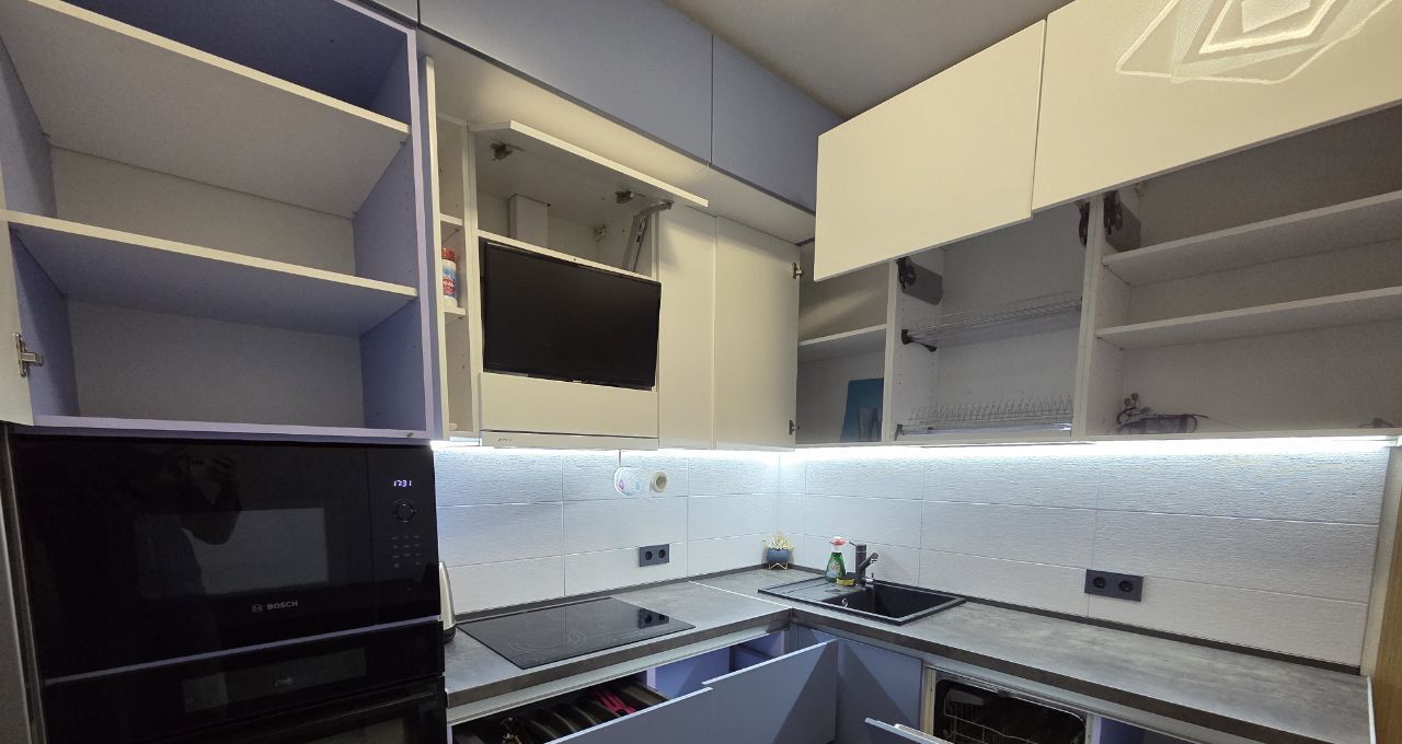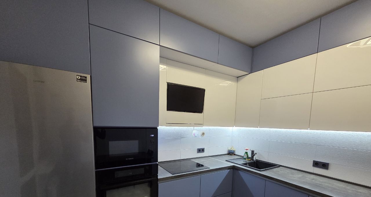 Просторная кухня оснащена современной дорогой качественной техникой: холодильник, варочная панель, вытяжка, телевизор, духовой шкаф и посудомоечная машина. Кухня имеет откидные и распашные дверцы с высококачественной фурнитурой. Установлен фильтр для воды с обратным осмосом. Встроенные шкафы обеспечивают очень много места для хранения вещей. Из кухни выход на застекленную лоджию, которая может использоваться как дополнительное пространство для отдыха.