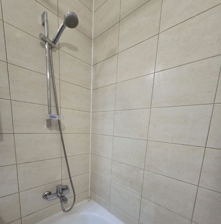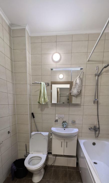 Санузел совмещенный, оборудован ванной и хорошей стиральной машиной. Проем над стиральной машиной занимает вместительный шкаф-пенал. В ванной установлен гигиенический душ.