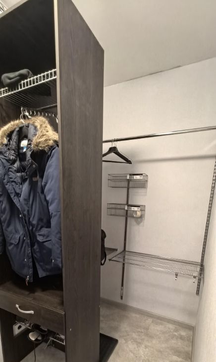 В коридоре удобный шкаф и гардеробная, оборудованная системой хранения.