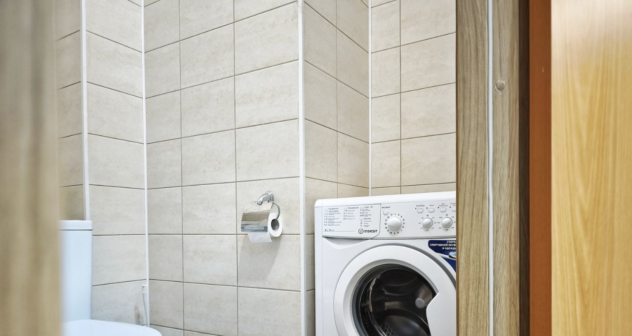 - ванная комната с ванной и стиральная машина на 5 кг,