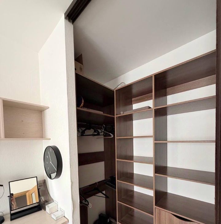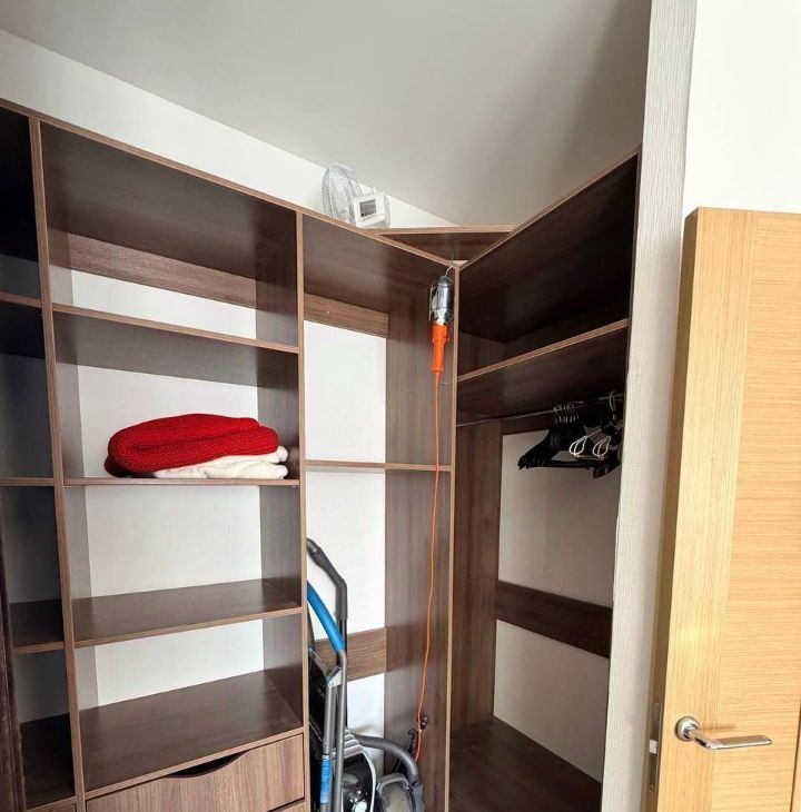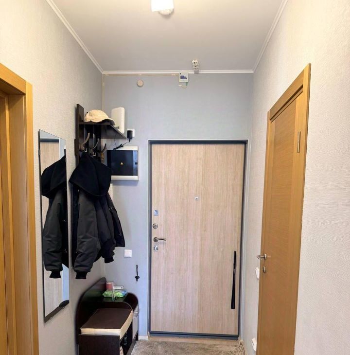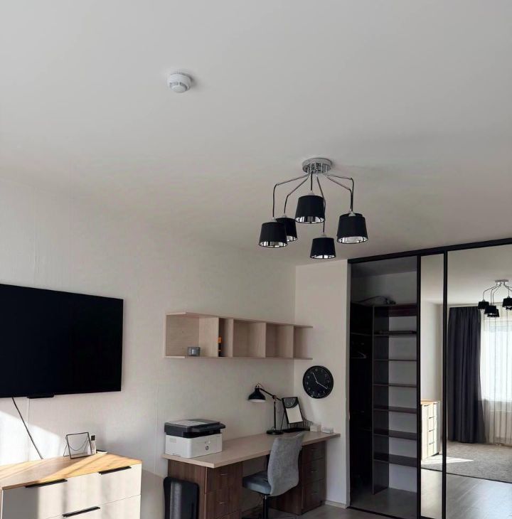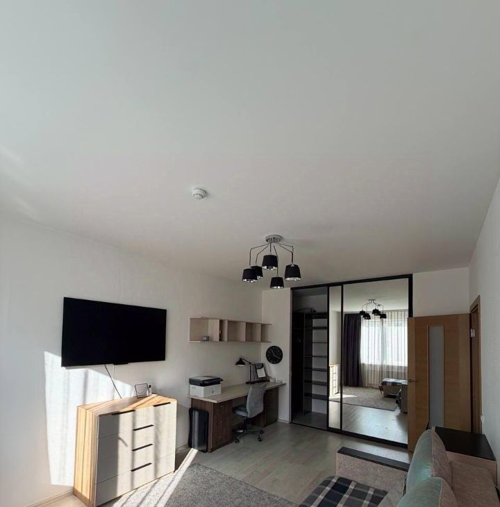 В жилой комнате: раскладной диван с подъемным механизмом, большой рабочий стол с ящиками, два комода, новый кондиционер с подключением к умному дому Алиса (управление с пульта и голосом), телевизор Яндекс с голосовым помощником. Гардеробная зона с зеркальными дверями (визуально расширяют пространство), оборудована штангами для длинной и короткой одежды, выдвижными ящиками, множеством полок различной высоты.