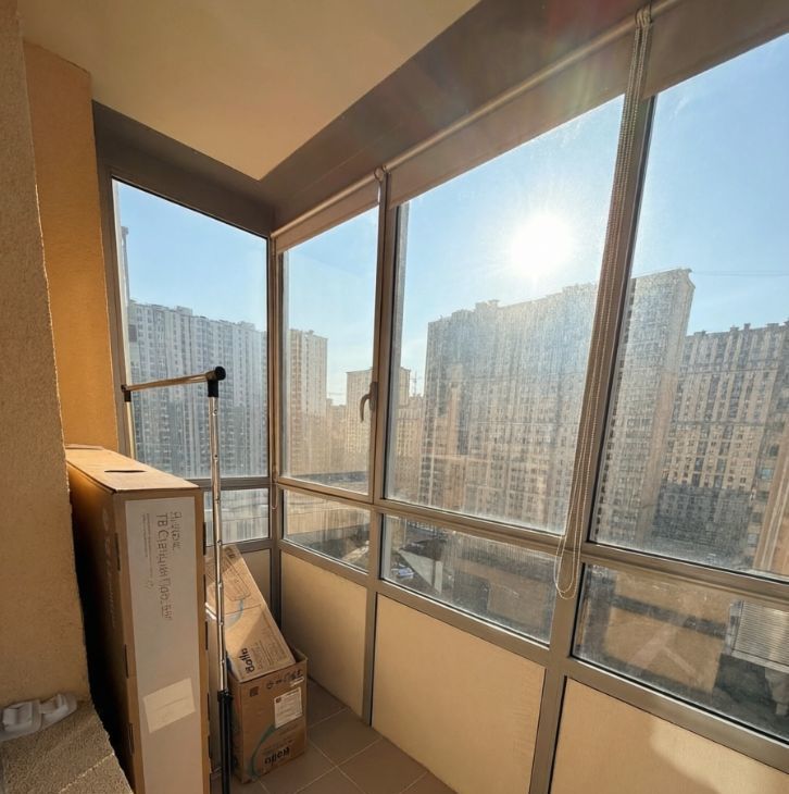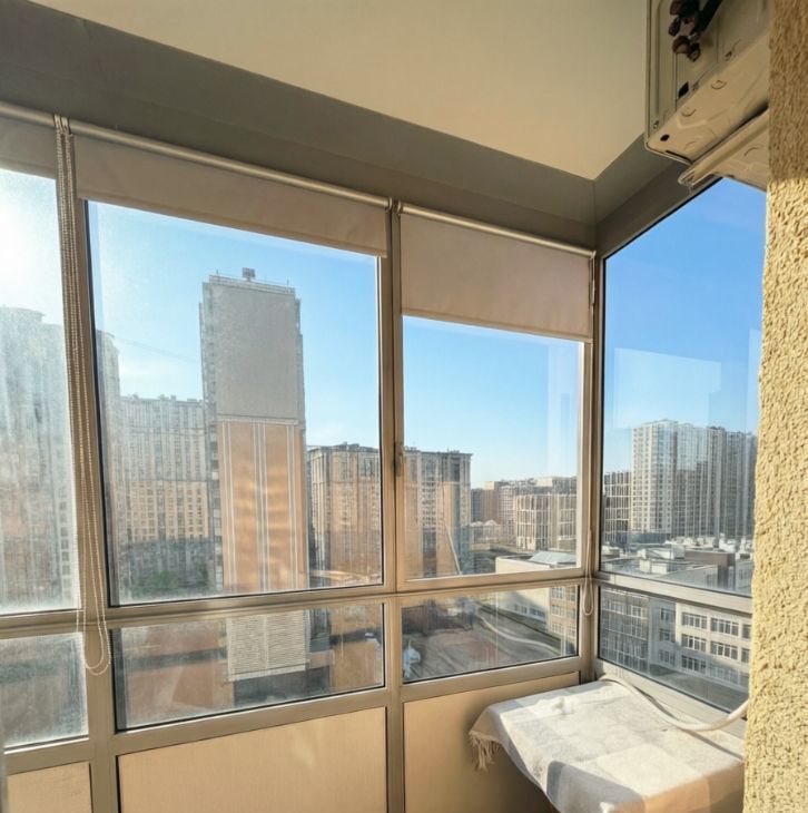 Большой балкон с рулонными шторами блэкаут, оборудован уютным местом для отдыха.