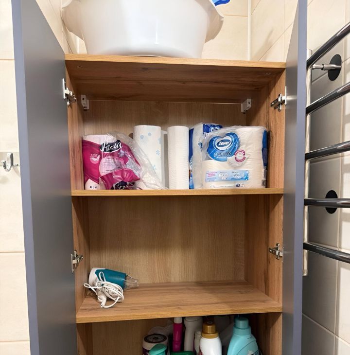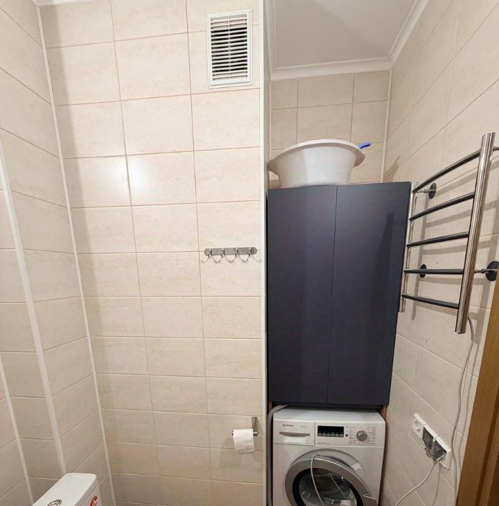 В ванной комнате: совмещенный санузел с современной сантехникой, стиральная машина, шкаф в нише для хранения бытовой утвари, электрическая батарея.