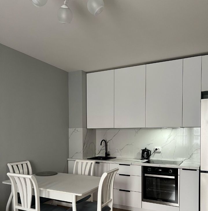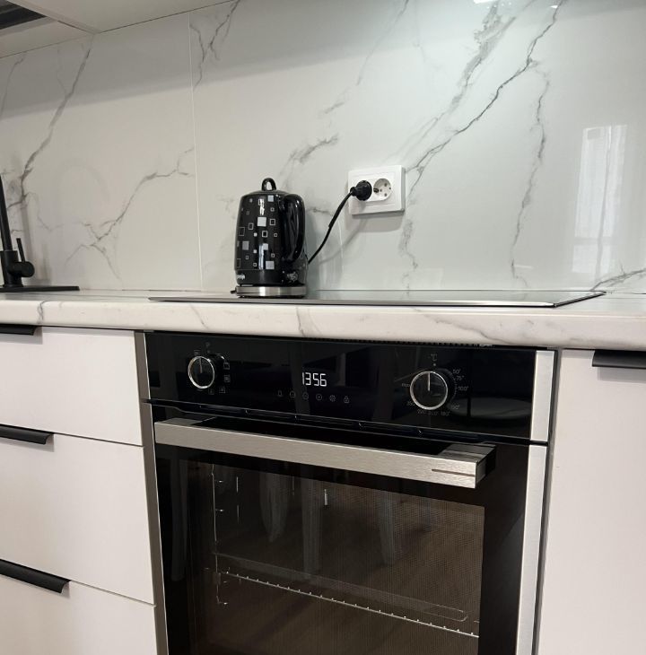 На кухне качественный гарнитур, бытовая техника - индукционная плита, вытяжка, духовка, холодильник, чайник.