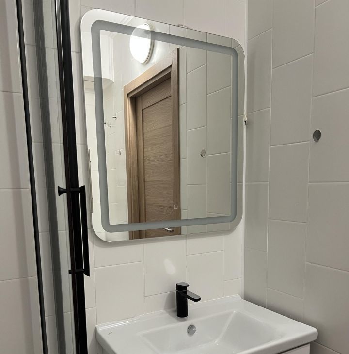 В ванной душевая кабина, тумба с раковиной, зеркало, электрический полотенцесушитель, стиральная машина.