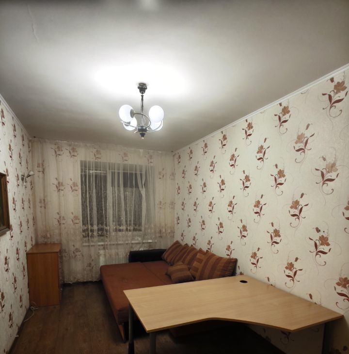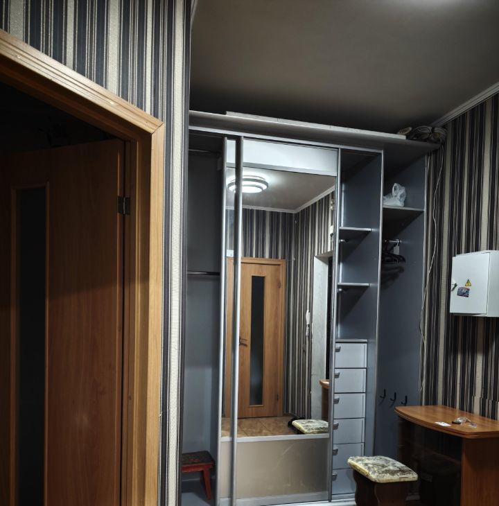 Большой встроенный шкаф в просторной прихожей. В комнате диван, комод, комп стол