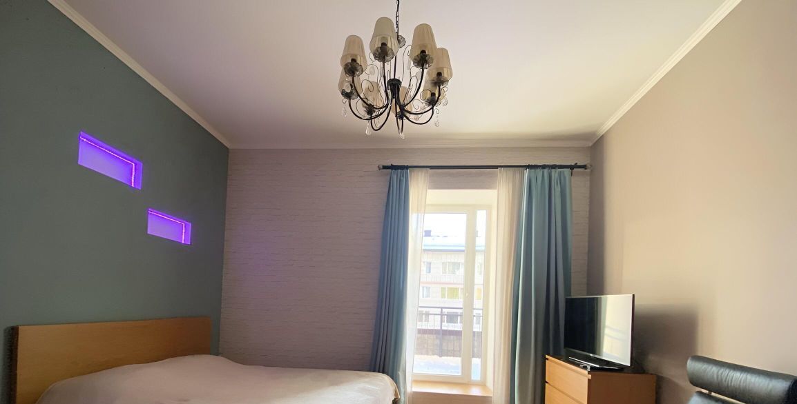 Кухня с выходом на балкон, просторная комната с большой двуспальной кроватью, зонированная на гостиную и спальную зону, из которой попадаешь на большую террасу.