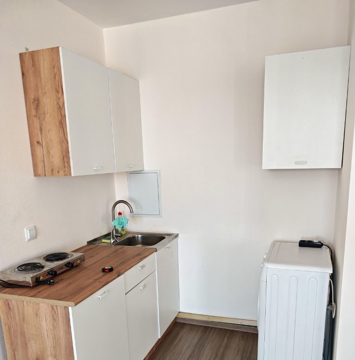 В квартире минимальное количество мебели: кухонный гарнитур, мини плитка, раскладной диван, стиральная машина, шкаф, туалетный шкафчик.