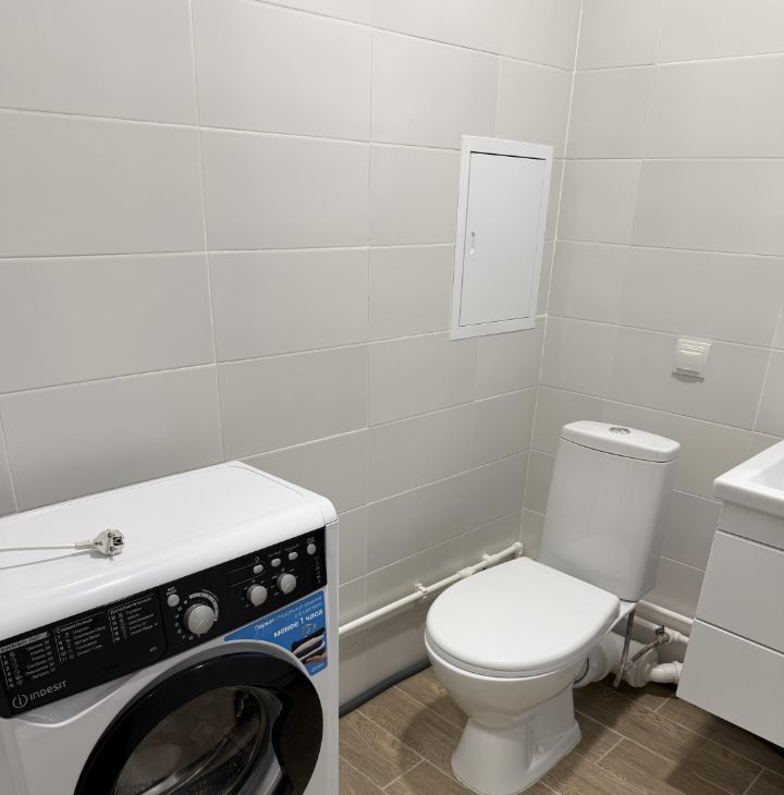В кухне-гостиной (15 кв.м) имеется двухместный раскладной диван, стол, стулья, кухонный гарнитур с необходимыми куханными принадлежностями, холодильник, вытяжка, варочная панель. Также квартира оснащена стиральной машиной, имеется утюг, гладильная доска, сушка для одежды. В комнате имеется просторная лоджия. Санузел совмещенный.