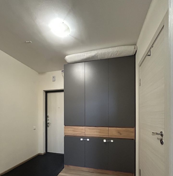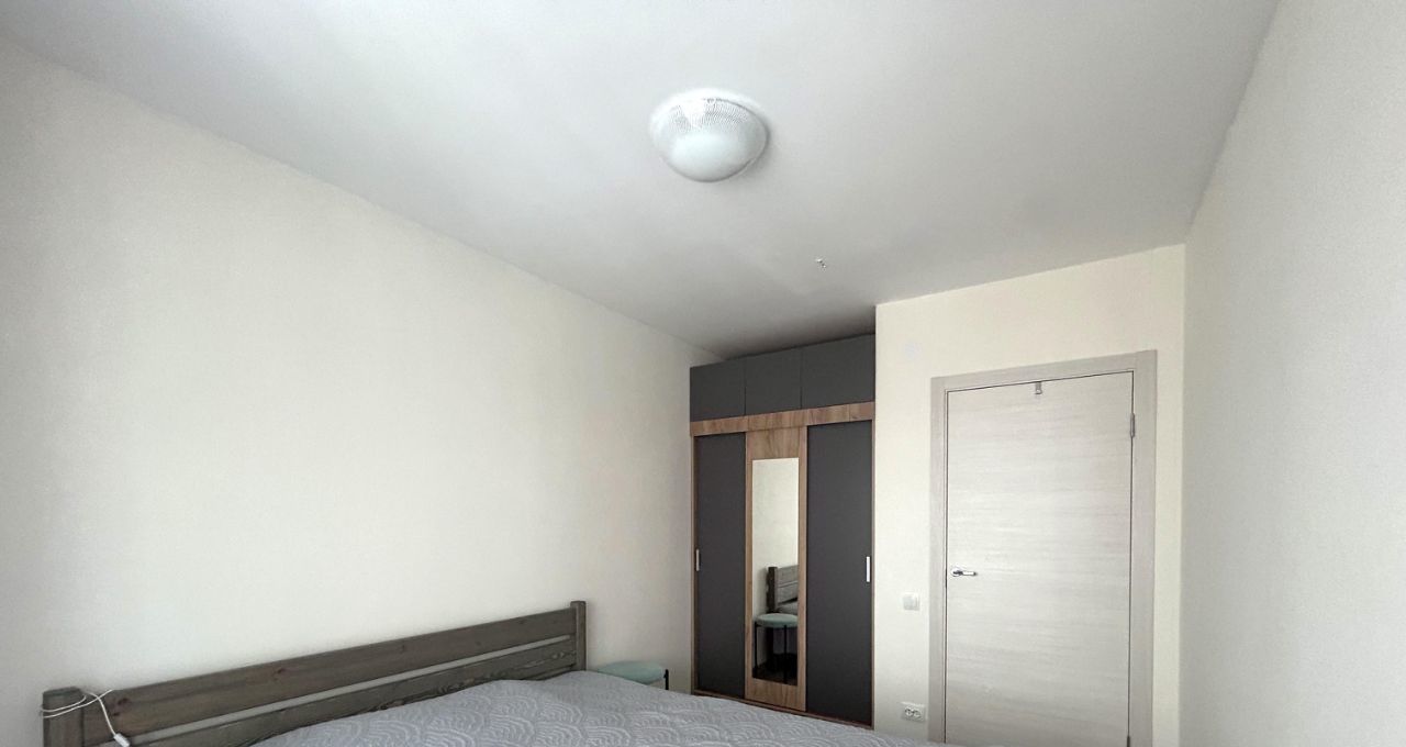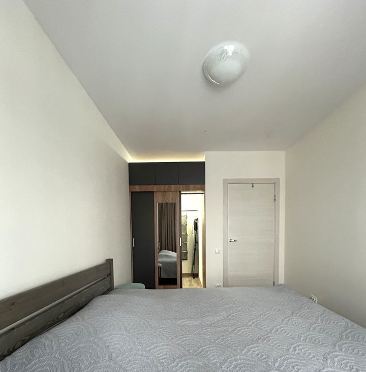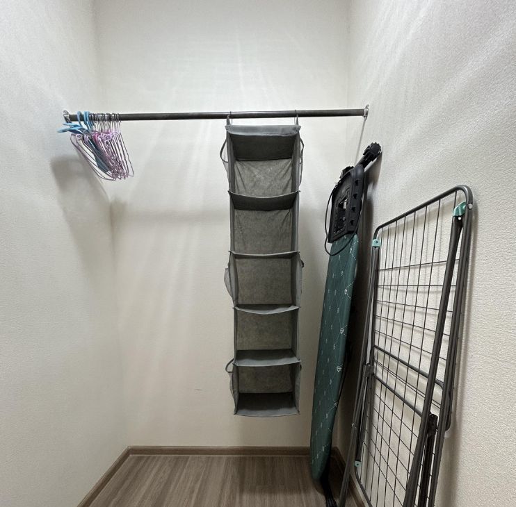 - В комнате: кровать с ортопедическим основанием и матрасом, размер спального места 1600, шкаф, гардеробная. Есть гладильная доска и сушилка для белья.