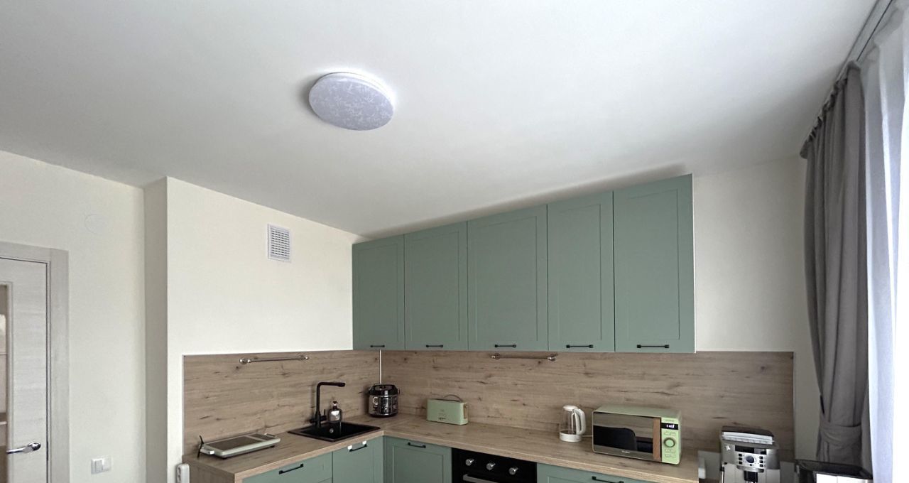 - В кухне: кухонная мебель, электрическая плитка, холодильник, обеденный стол, 2 стула, диван-кровать, бытовая техника: микроволновая печь, тостер, мультиварка, кофемашина, эл. чайник.