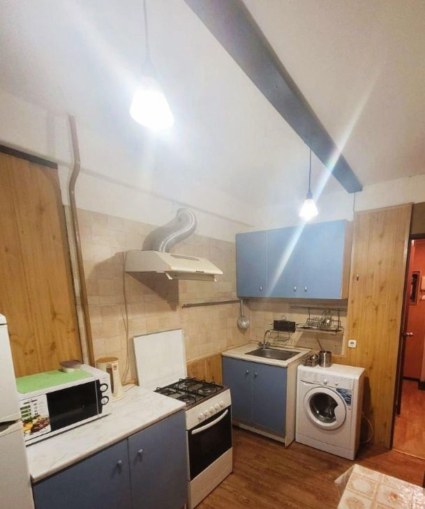 Для проживания есть все необходимое - кровать 2х спальная с хорошим ортопедическим матрасом, 3х створчатый шкаф-купе, кухонная мебель, стиральная машина-автомат, 2х камерный холодильник.