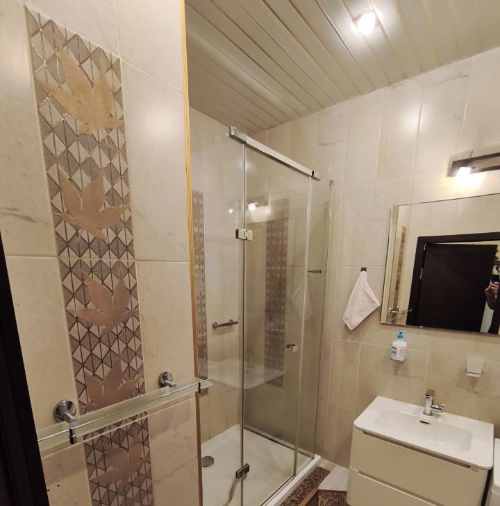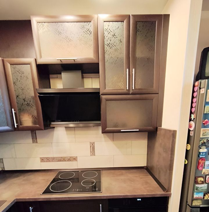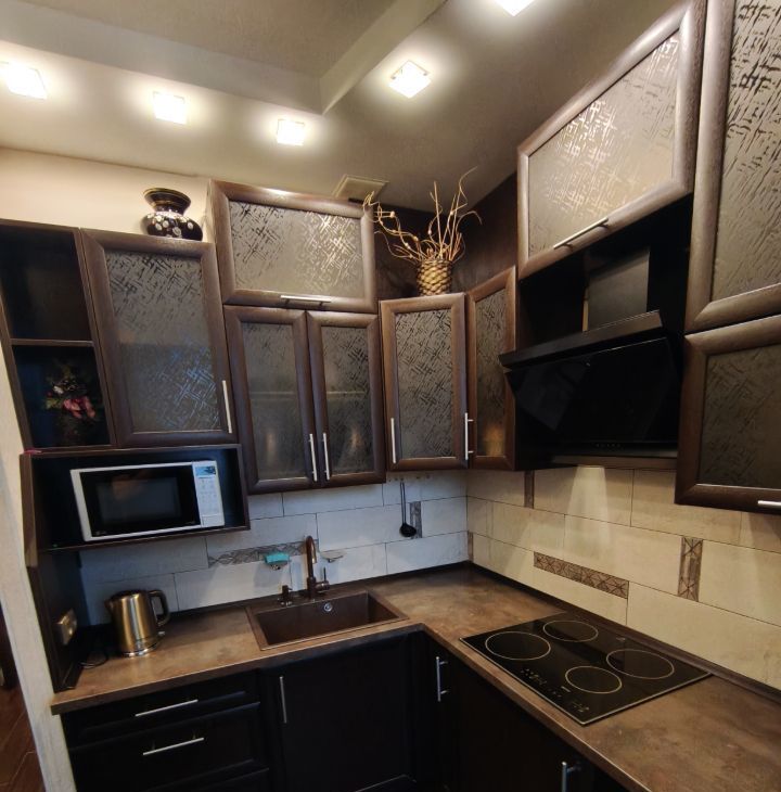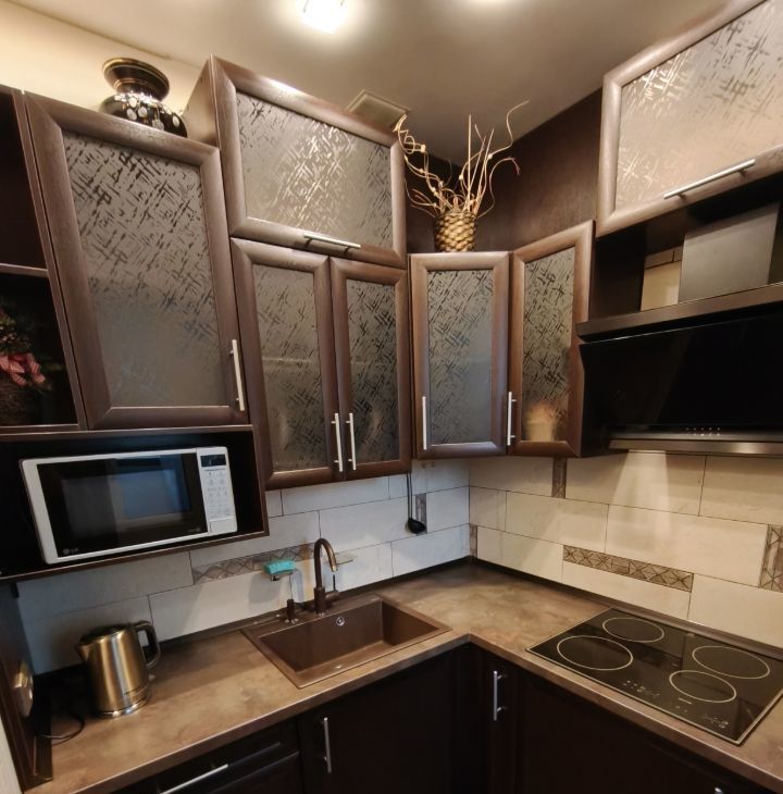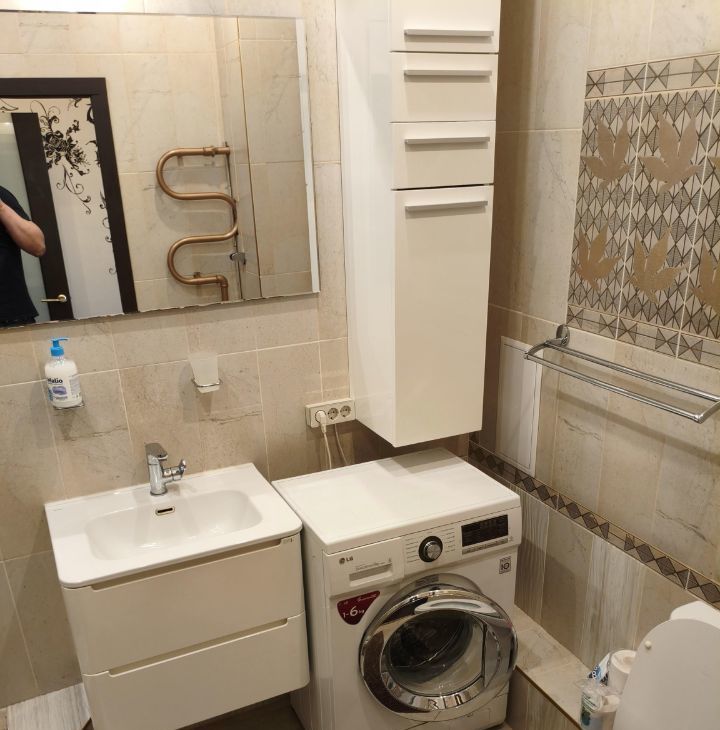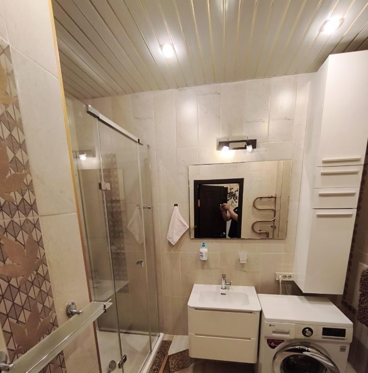 Кухня оснащена всем необходимым: современная встроенная техника, холодильник, микроволновая печь, варочная панель и духовой шкаф.В ванной комнате установлена душевая кабина. На кухне расположен выход на лоджию оснащённую удобными шкафами.