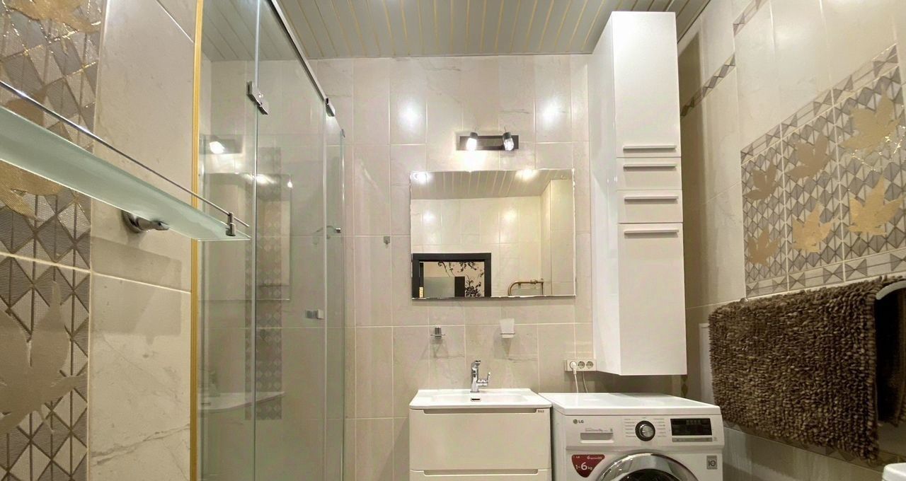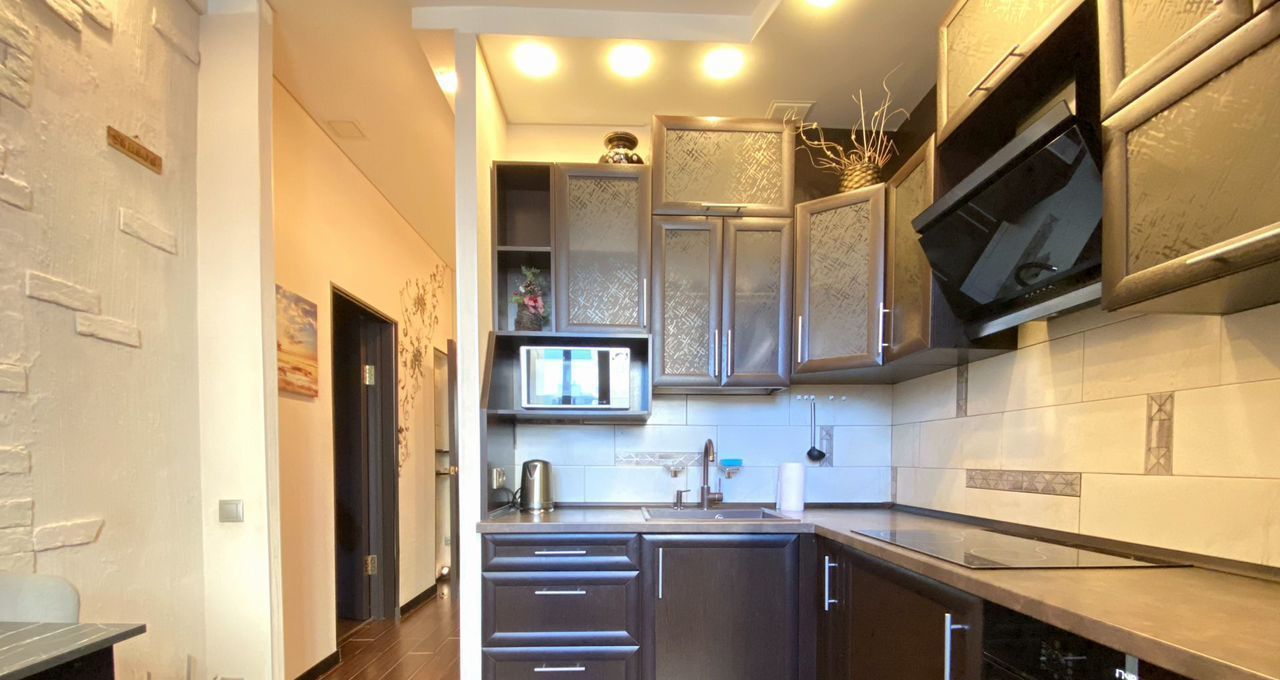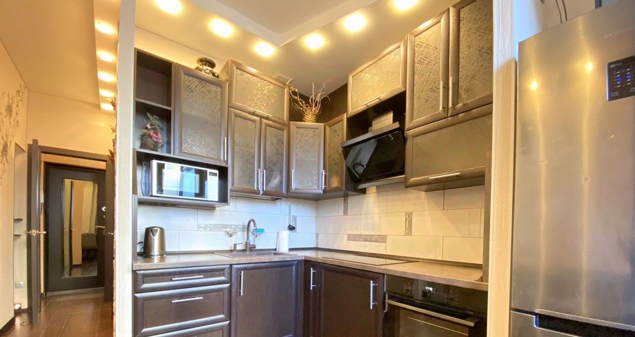 Есть все необходимое для комфортного проживания: кухонный гарнитур, электроплита с духовкой, холодильник, кухонный стол со стульями, ОГРОМНОЕ количество мест для хранения вещей, стиральная машина, телевизор, диван-кровать и т.д.
