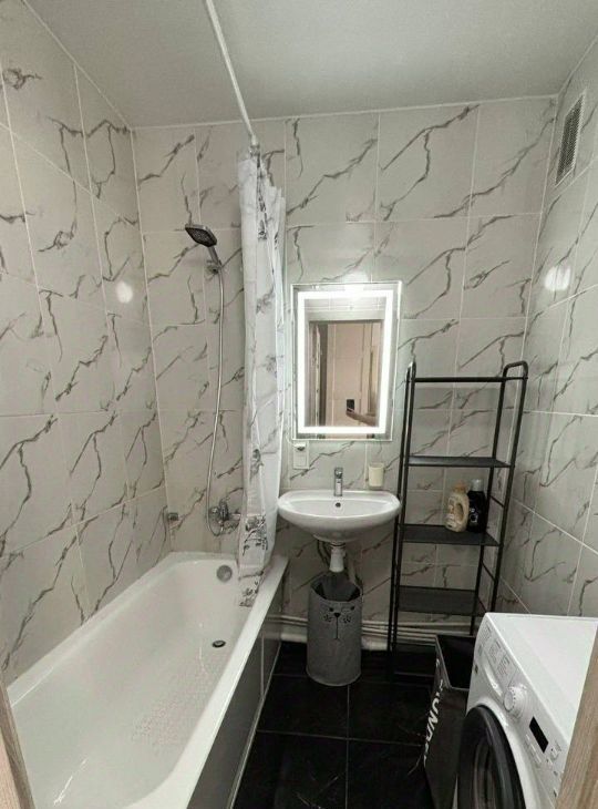 - Ванная комната: Установлены ванна, стиральная машина и бойлер.