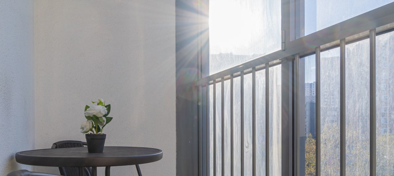 - панорамный балкон с потрясающим видом особенно на ночной город со столом и стульями