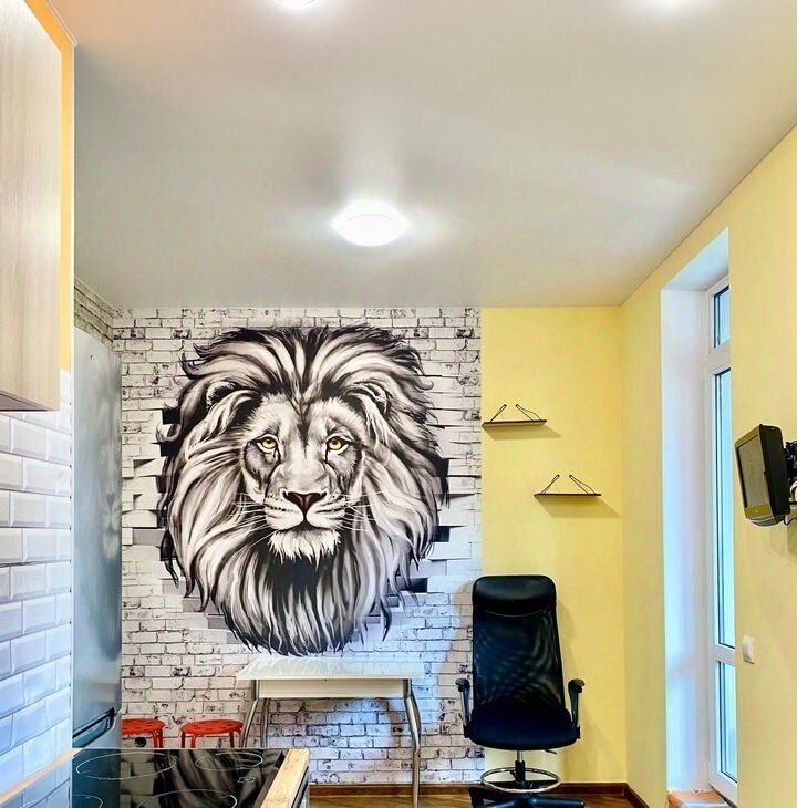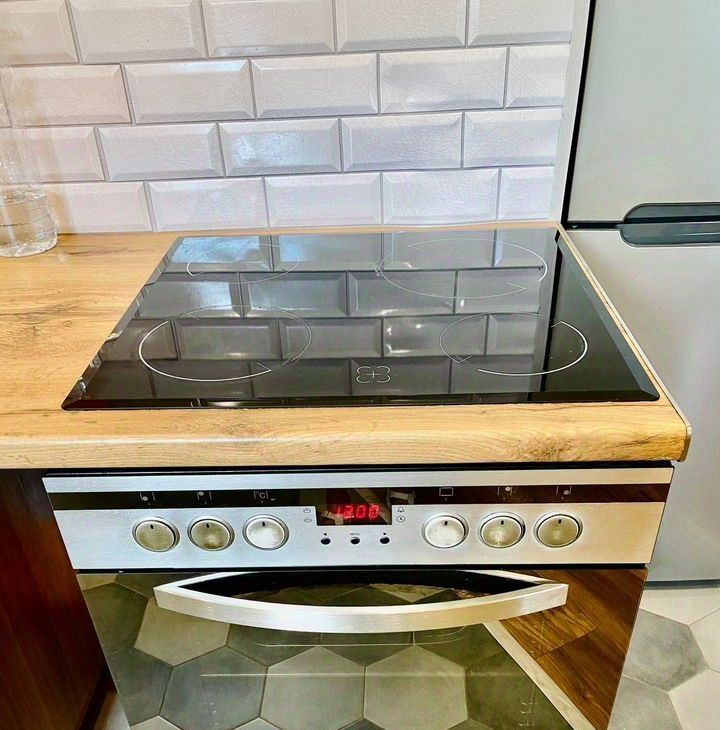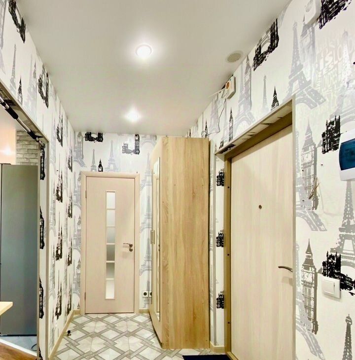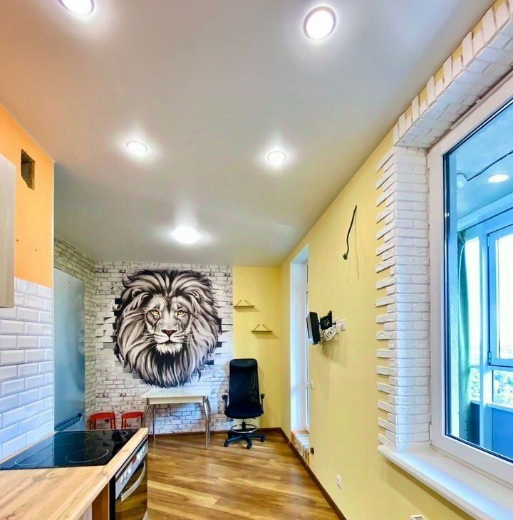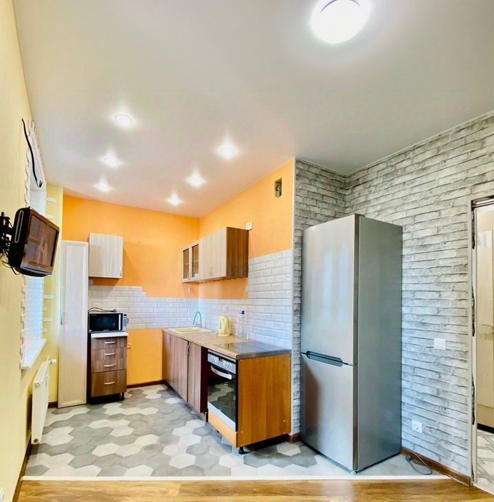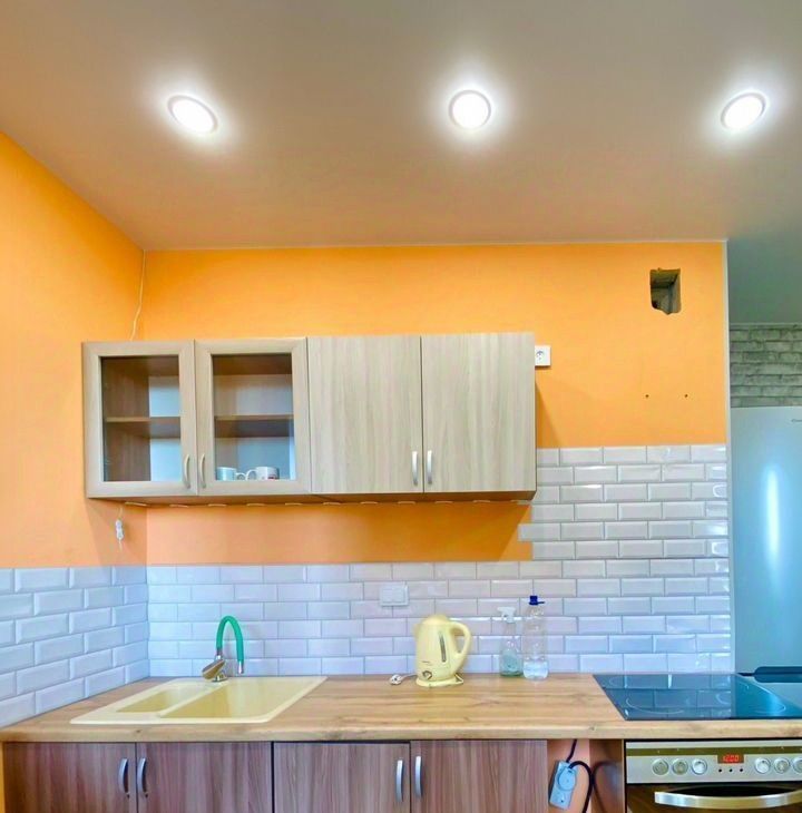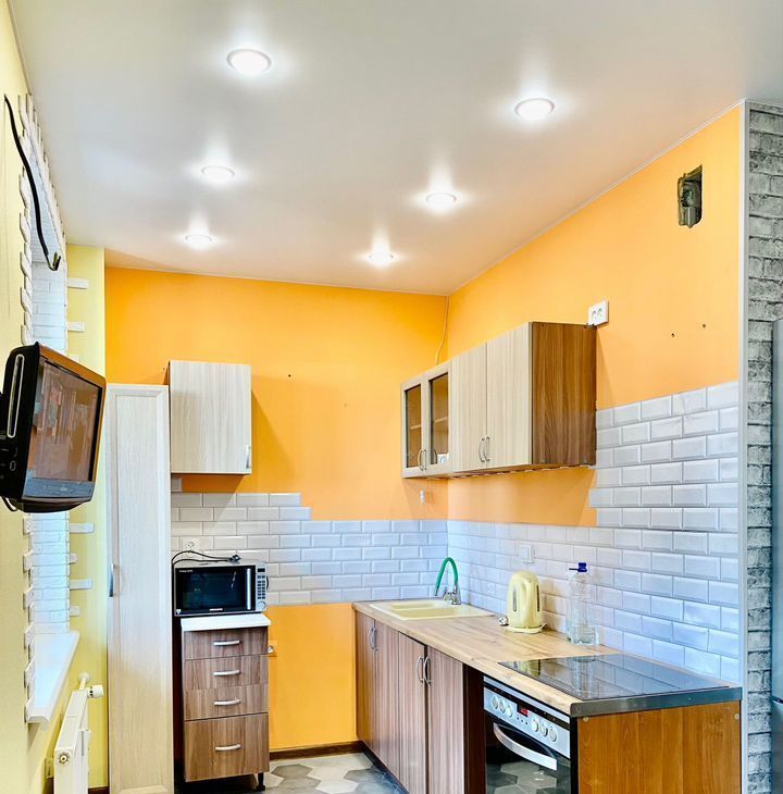 Сдeлан качественный coвpeмeнный ремонт, установлен встроенный кухонный гарнитур, новый холодильник, микроволновая печь, ст.машина, телевизор. В комнате двухспальный диван, много мест для хранения вещей.