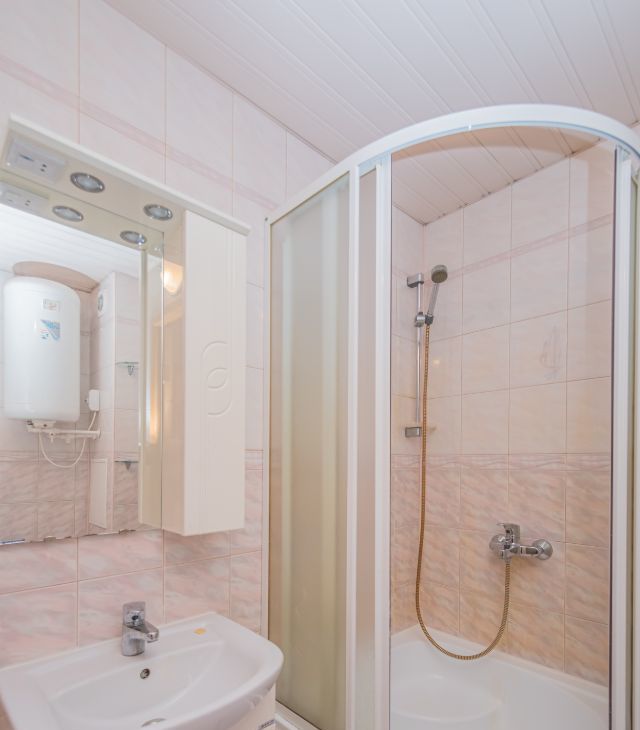 Санузел совмещенный, встроенная мебель с раковиной и зеркалом с подсветкой. Душевая кабина.