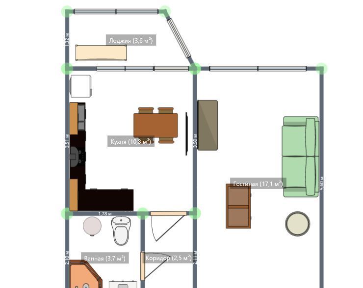 Размеры помещений: 45 м общ (вкл. лоджию)