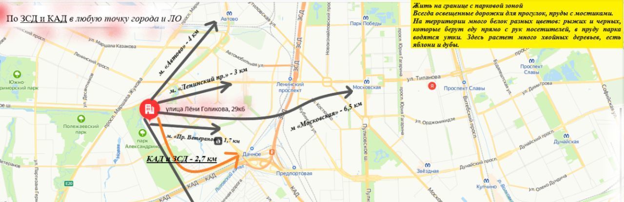 до ст. м. пр. Ветеранов (1.7 км.); КАД и ЗСД 2,7 км; аэропорт Пулково (10 км); ст. м. Московская 6,5 км; ст. м. Ленинский пр. 3 км ; ст. м. Автово 4 км;