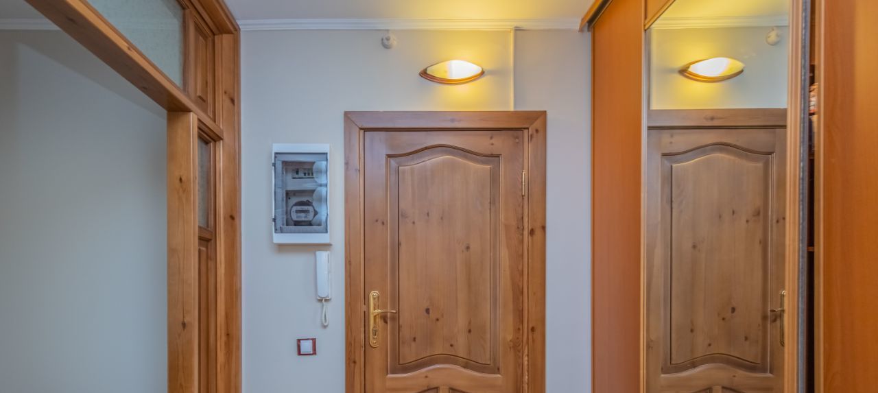 В просторной прихожей квартиры имеется оборудованная системой хранения гардеробная.