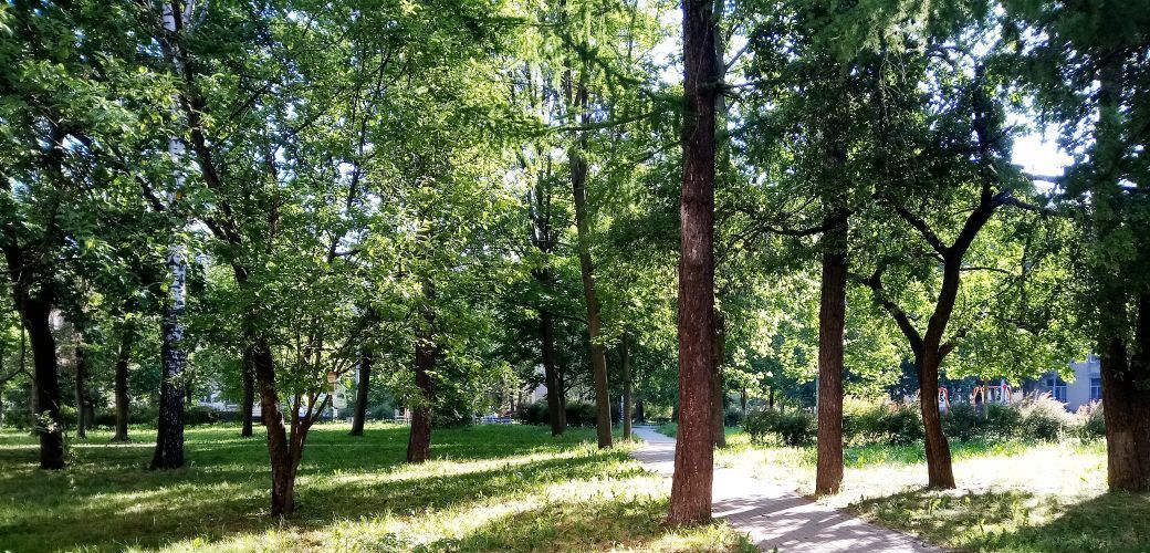 Во дворе много зелени, детская площадка, всегда найдется место для парковки.