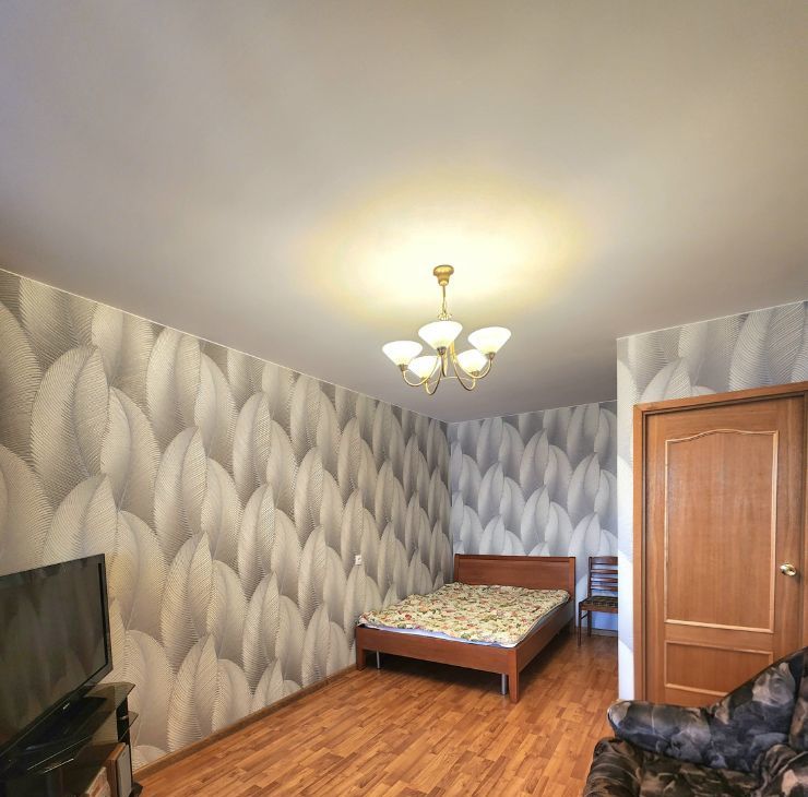 В комнате установлена двухспальная кровать с ортопедическим основанием и новым матрасом, большой телевизор, шкаф, комод, кресло.
