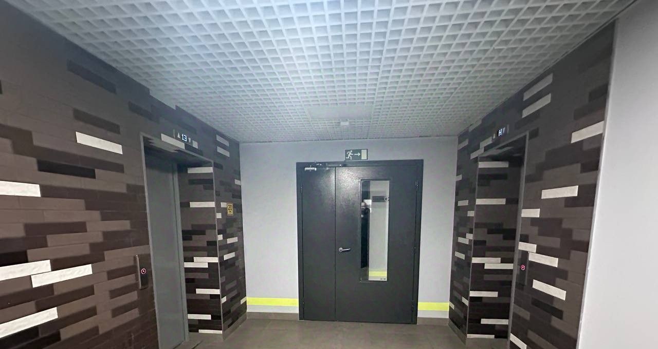 На этаже два пассажирских и один грузовой лифт. Парковка за шлагбаумом во дворе
