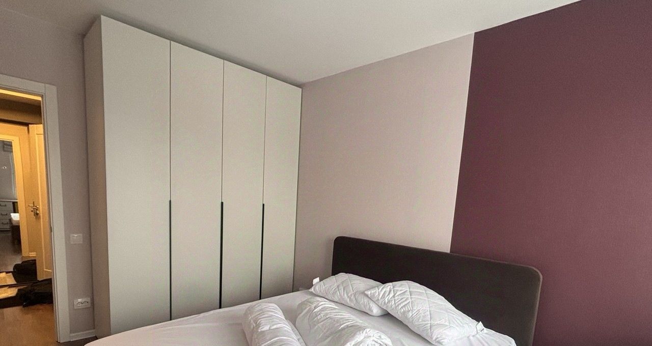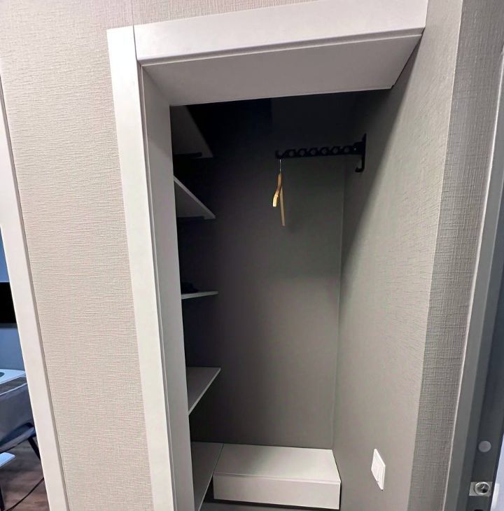 Спальня оборудована системой шкафов и большим шкафом вдоль стены