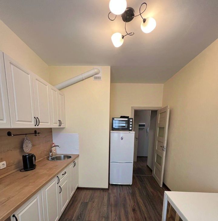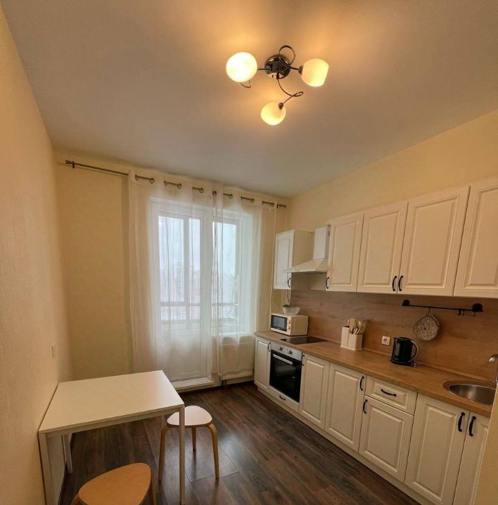 - Есть всё для комфортного проживания: встроенная кухня с бытовой техникой (варочная панель, духовой шкаф, вытяжка, холодильник), обеденный стол со стульями, также есть новая стиральная машина.