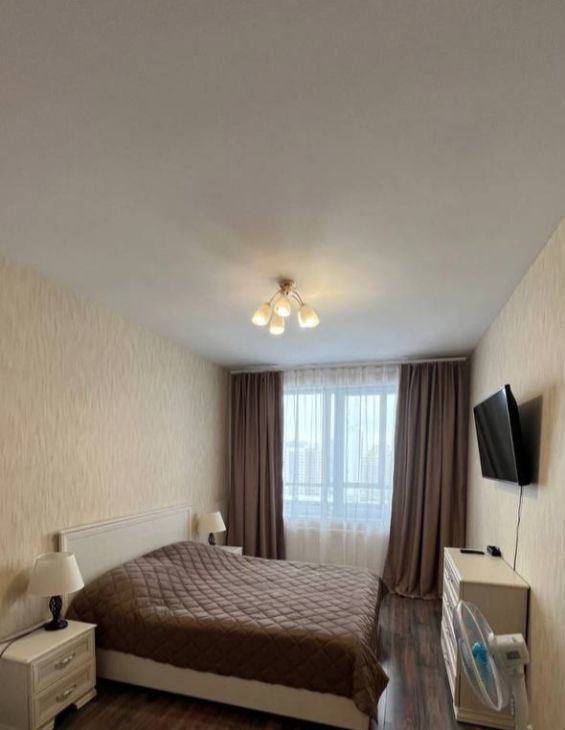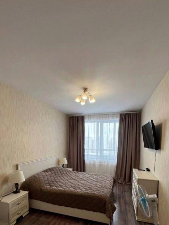 - В комнате набор шикарной светлой мебели: 2-ух спальная кровать, прикроватные тумбочки, шкаф для одежды, комод для белья, большой телевизор.