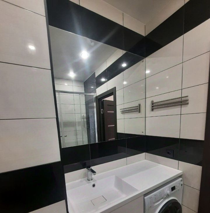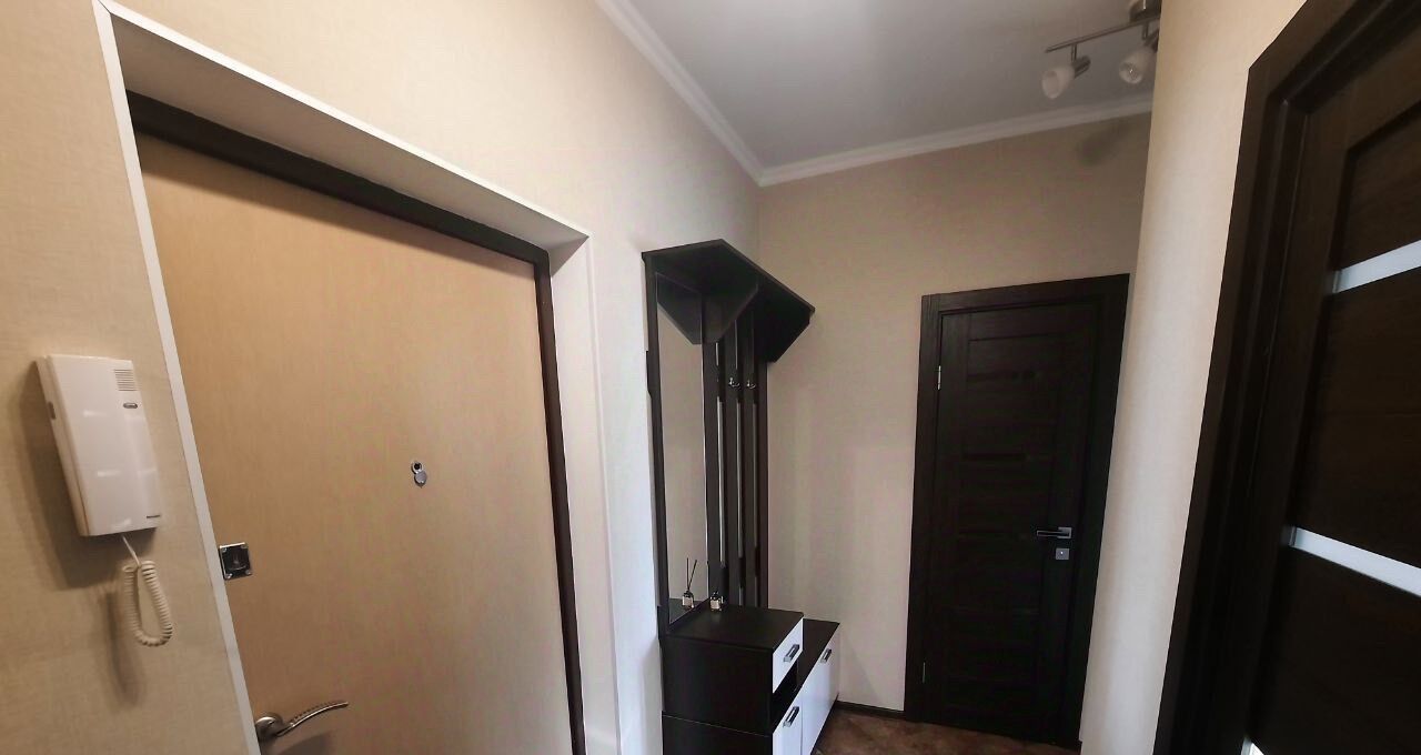 Кухня оснащена необходимой бытовой техникой: холодильником, электрической плитой, духовкой, фильтром для питьевой воды и чайником. В жилой комнате имеется телевизор, вместительный шкаф, тумба и стол, который можно использовать как рабочее место. В ванной комнате установлена душевая кабина, унитаз и вместительная стиральная машина. В прихожей предусмотрены дополнительные места для хранения, в том числе зеркало и шкаф.