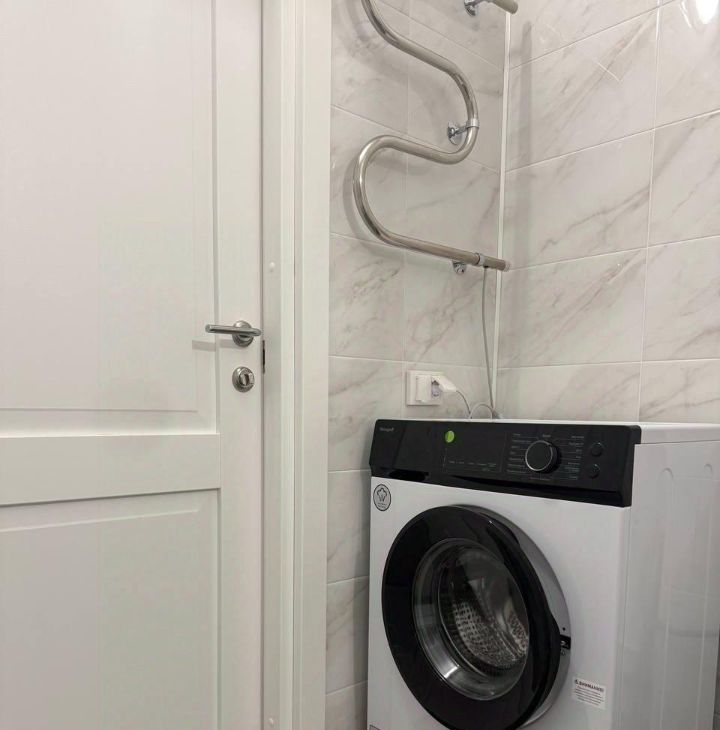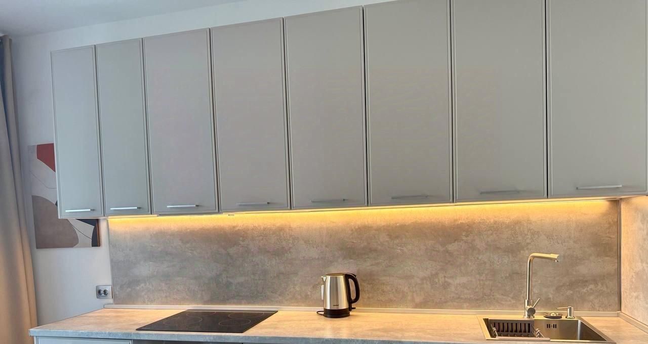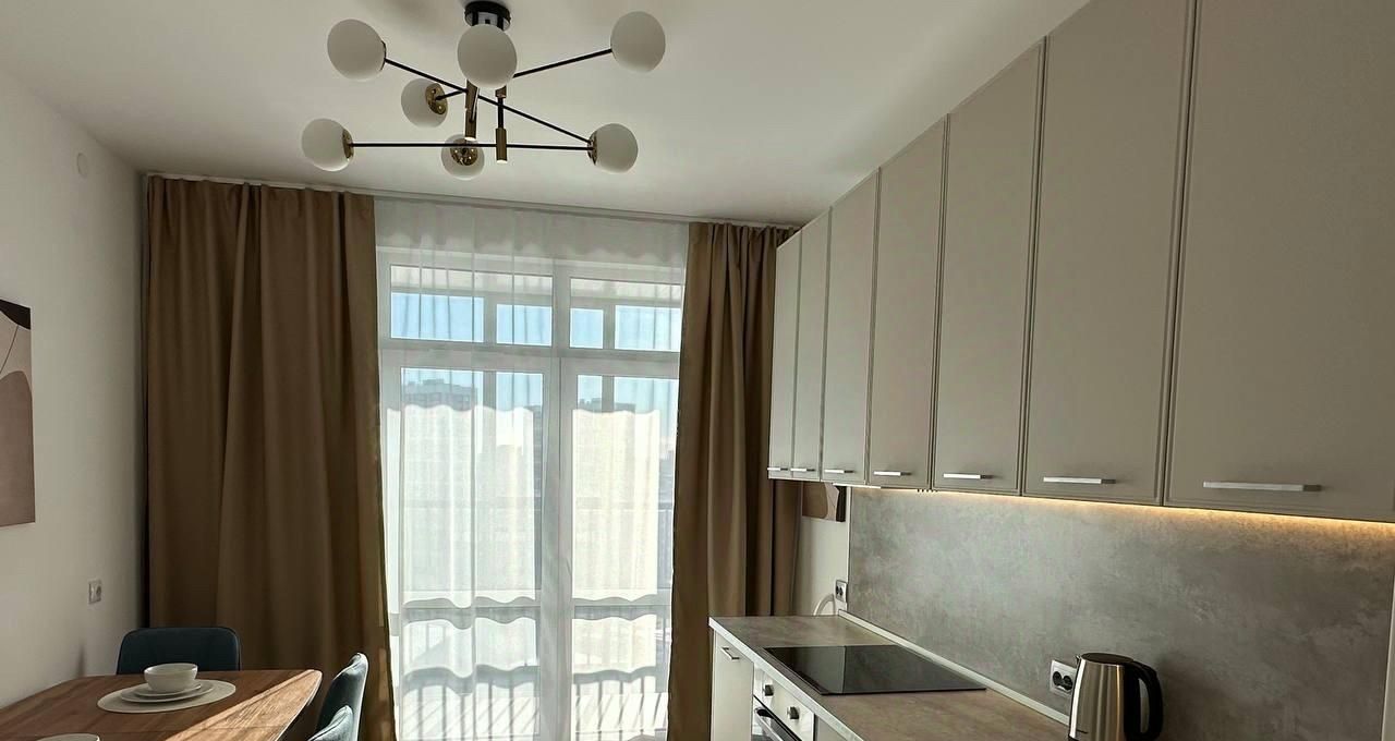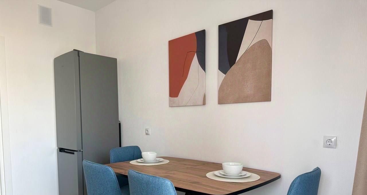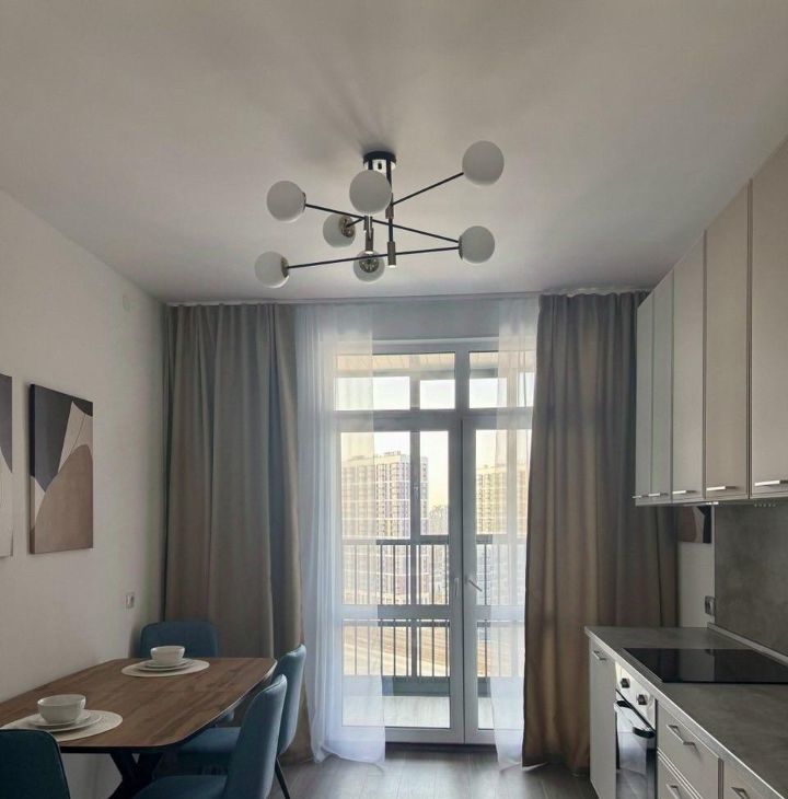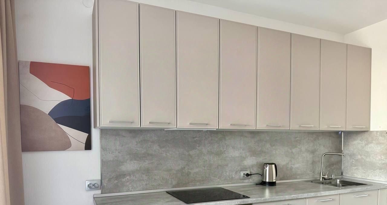 В квартире есть кухня с большой лоджией. Кухонный гарнитур и обеденная зона рассчитана на проживание семьи, где можно разместиться с комфортом. В квартире есть вся необходимая бытовая техника (холодильник, посудомоечная машина, духовка, варочная поверхность, чайник, стиральная машина, вытяжка, пылесос) также есть комплект посуды, включая столовые приборы. В прихожей есть большой шкаф для хранения.
