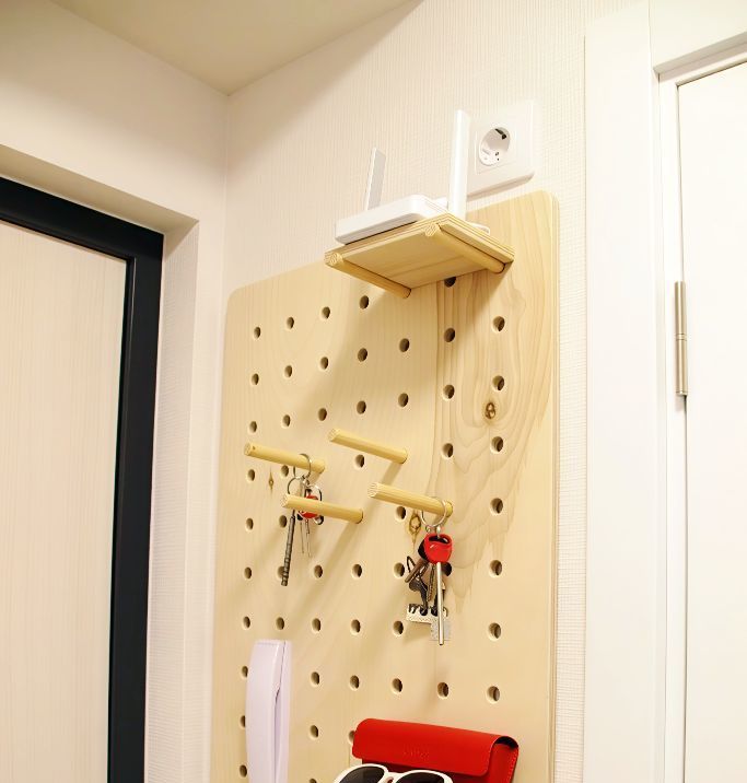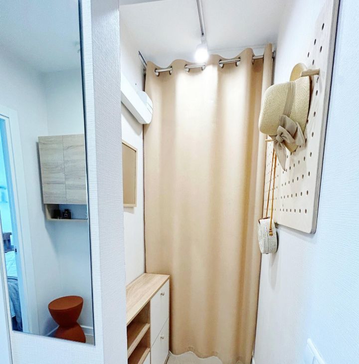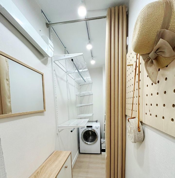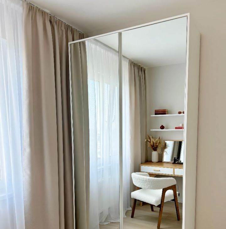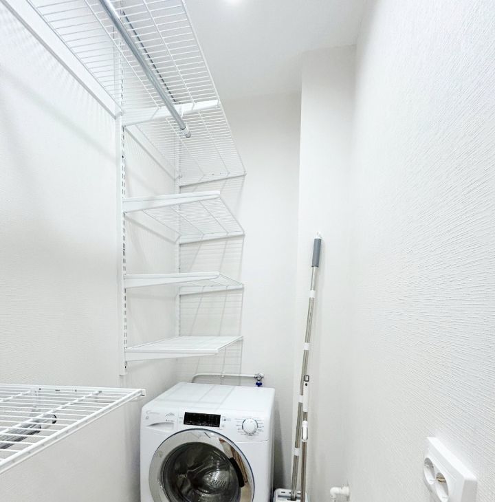 Особенность квартиры — встроенная просторная гардеробная с системой хранения, где можно перевесить все полки и штанги на свое усмотрение.