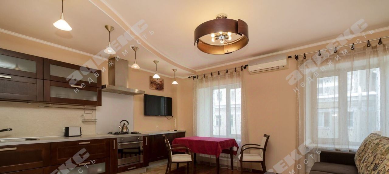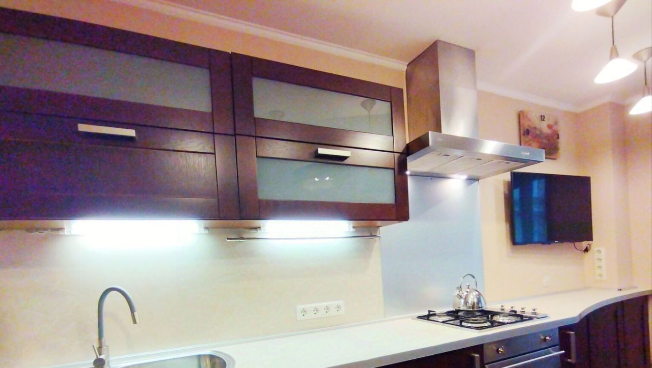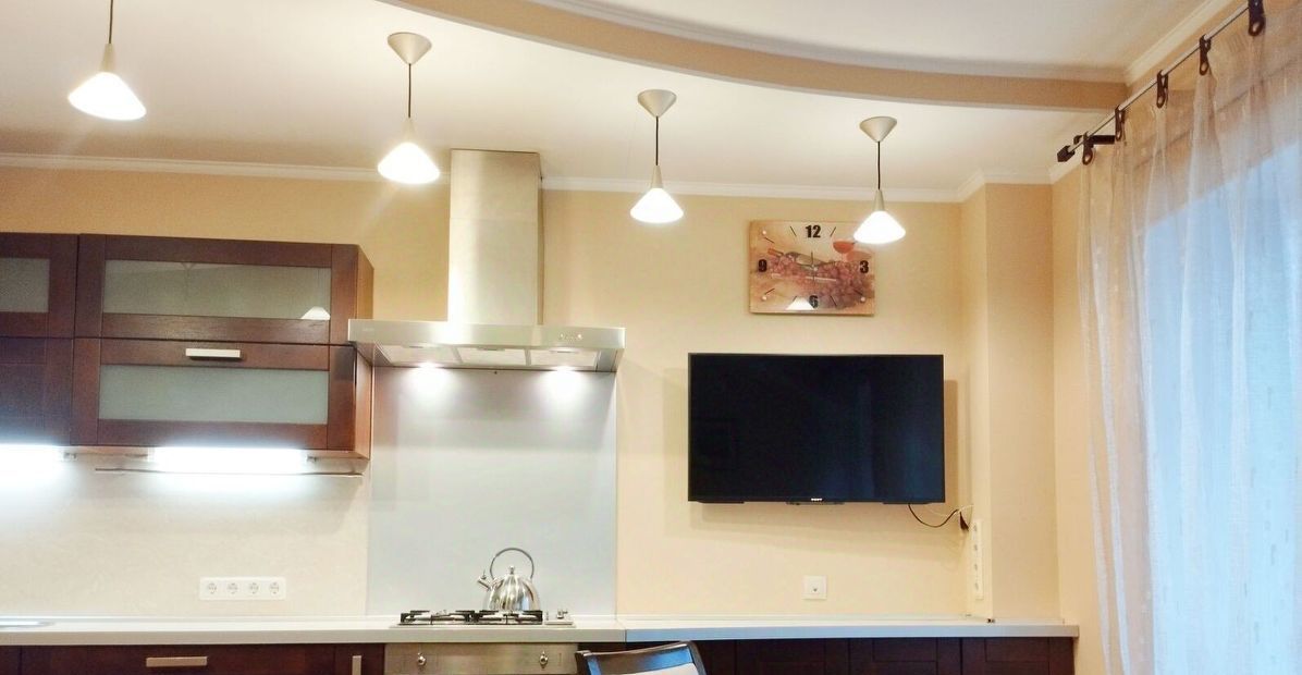 В огромной кухне-гостиной (23 кв.м.) большая зона для приготовления еды, обеденный стол, современная качественная бытовая техника, посудомоечная машина, телевизор и уютный диван, выполненный на заказ.