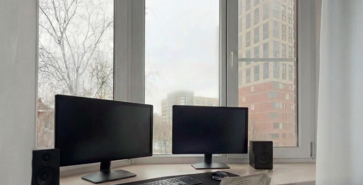В квартире сделано удобное рабочее место для удаленной работы: расширенный подоконник для мониторов и книг, проводной интернет для надежной связи.