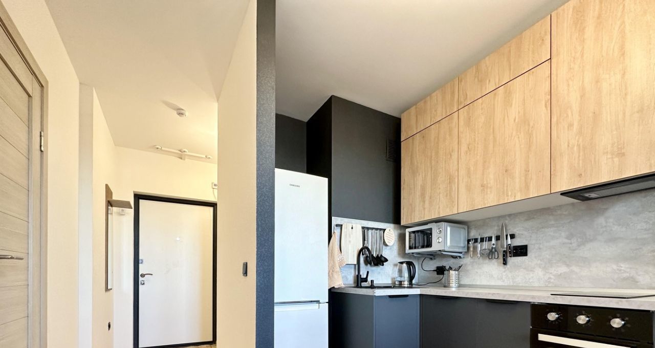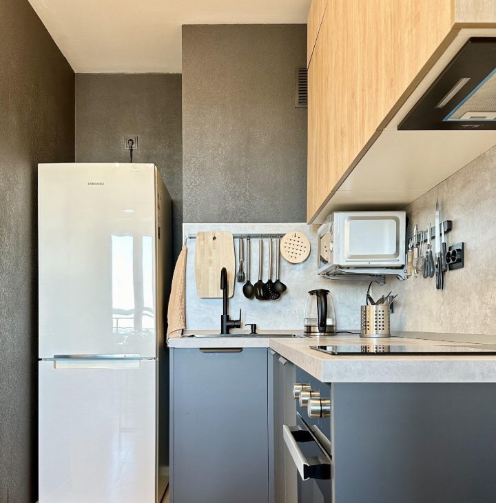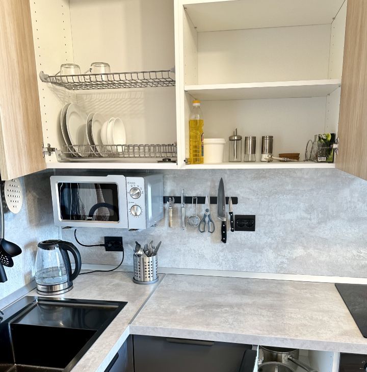 - УДОБНАЯ КУХНЯ со всей нужной техникой (холодильником Samsung, индукционной плитой, микроволновкой, чайником, духовкой, посудомойкой), а также посудой для готовки, приёма пищи и приборами;