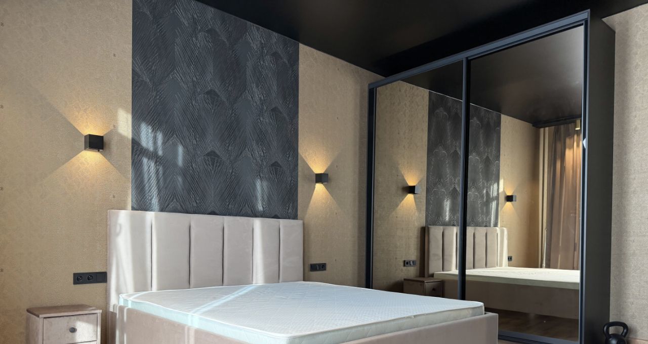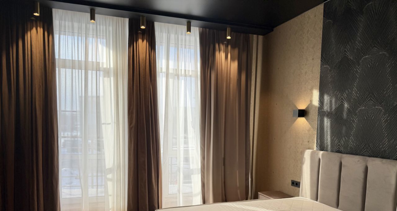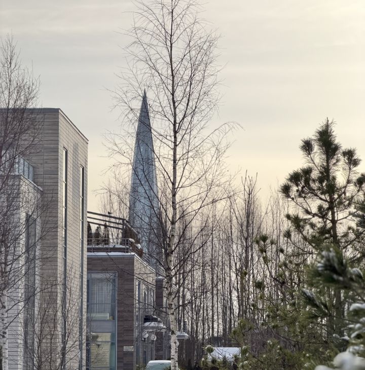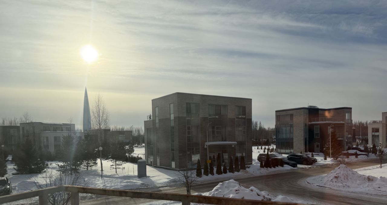 Спальня: двуспальная кровать , вместительный шкаф с зеркалами . Из окон открывается живописный вид на поселок и архитектурную доминанту района — башню Лахта Центра.