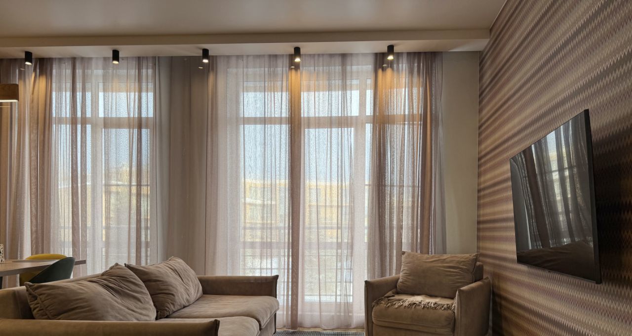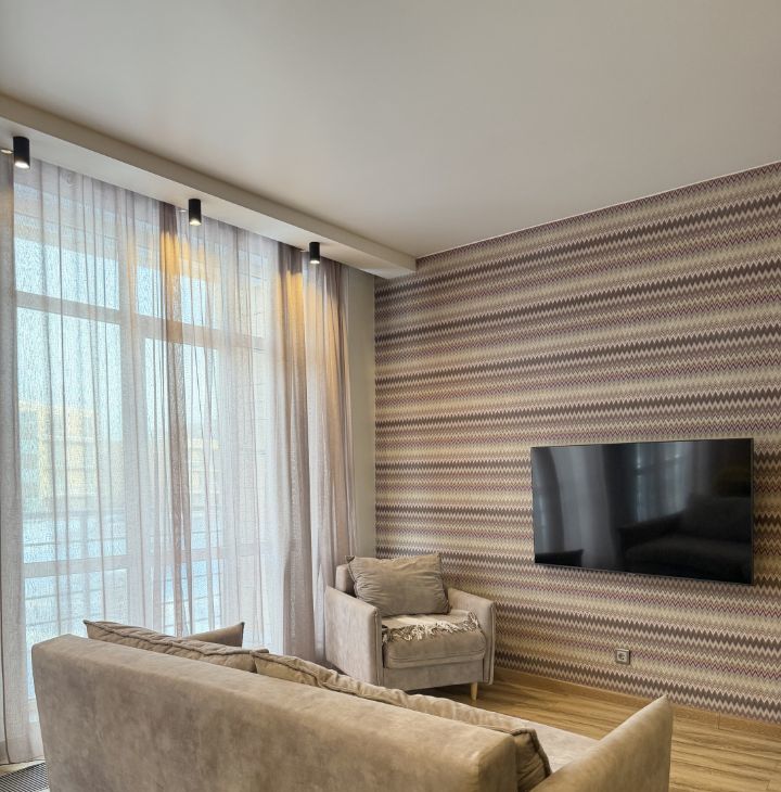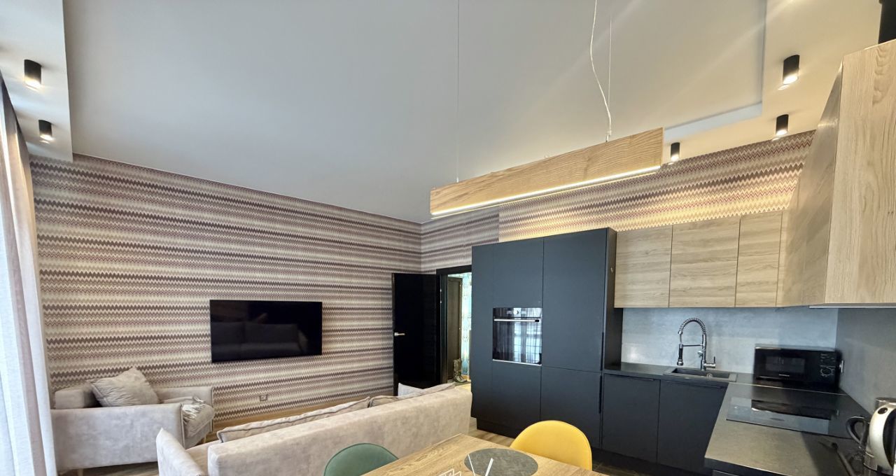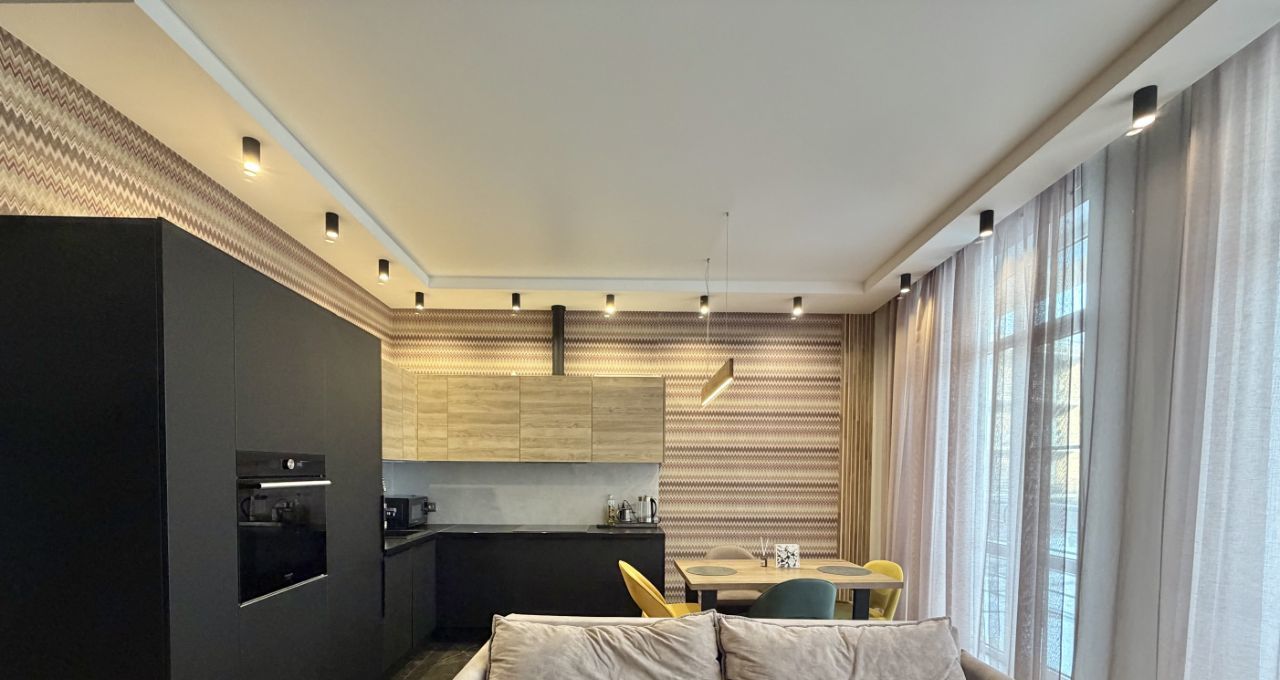 Кухня-гостиная (евро-формат): полностью интегрированная кухонная зона с техникой (посудомоечная машина, встроенный холодильник, духовой шкаф). В гостиной зоне — мягкая мебель (диван со спальным местом, кресло), телевизор.