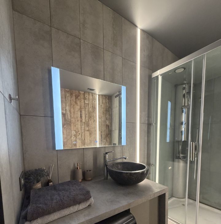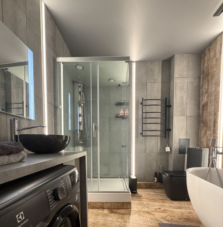 Санузел: просторный, душевая кабина, ванна и стиральная машина.