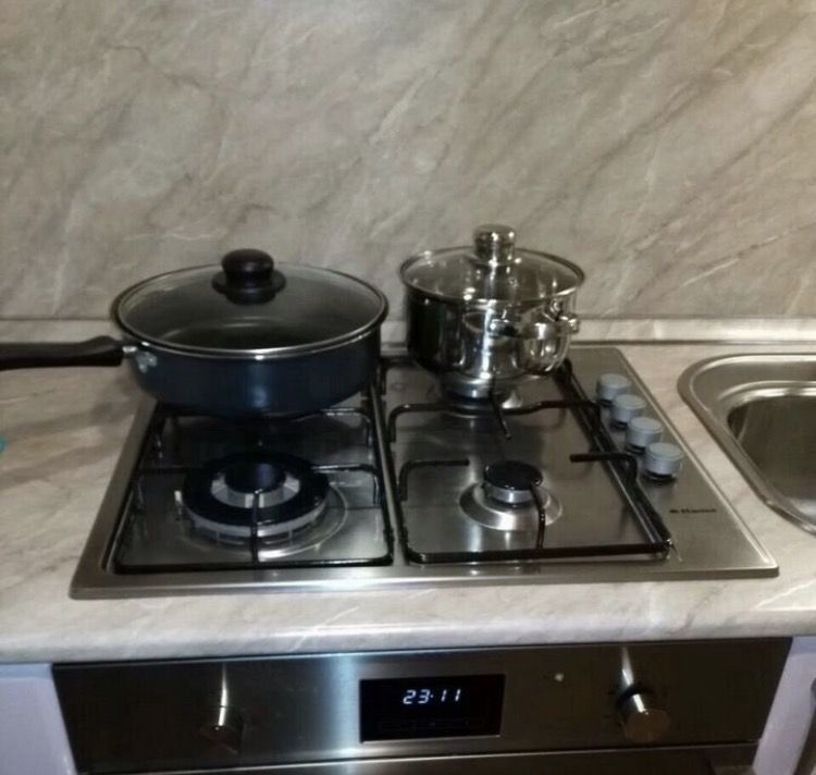 кухня со встроенной техникой (газовая варочная поверхность, духовой шкаф, вытяжка), холодильником, СВЧ;