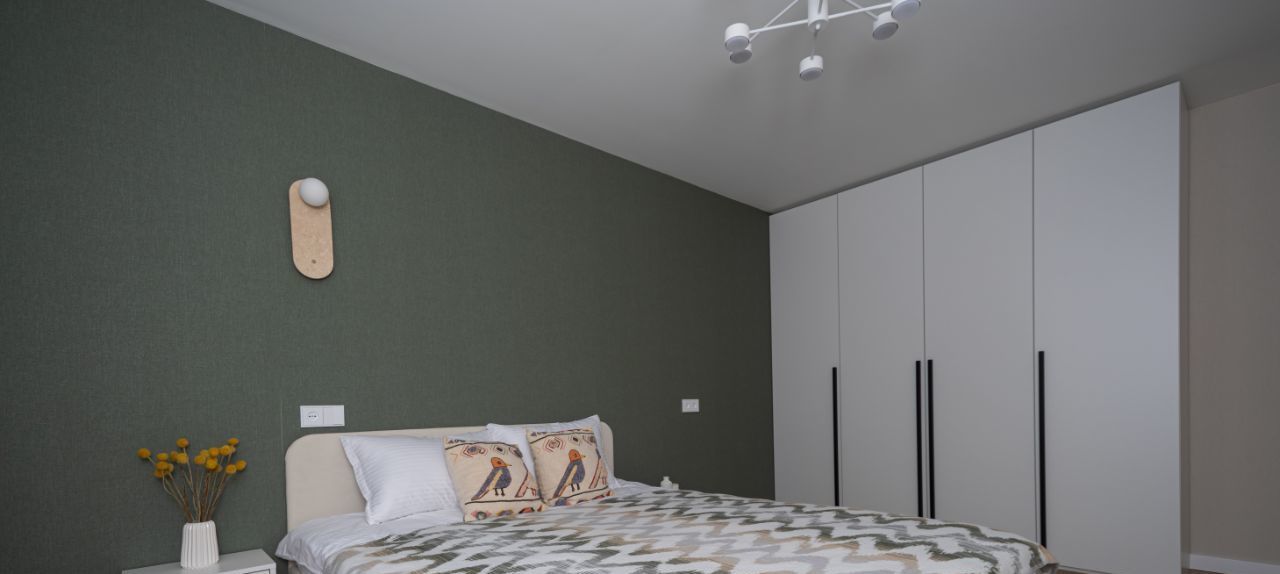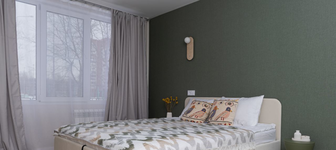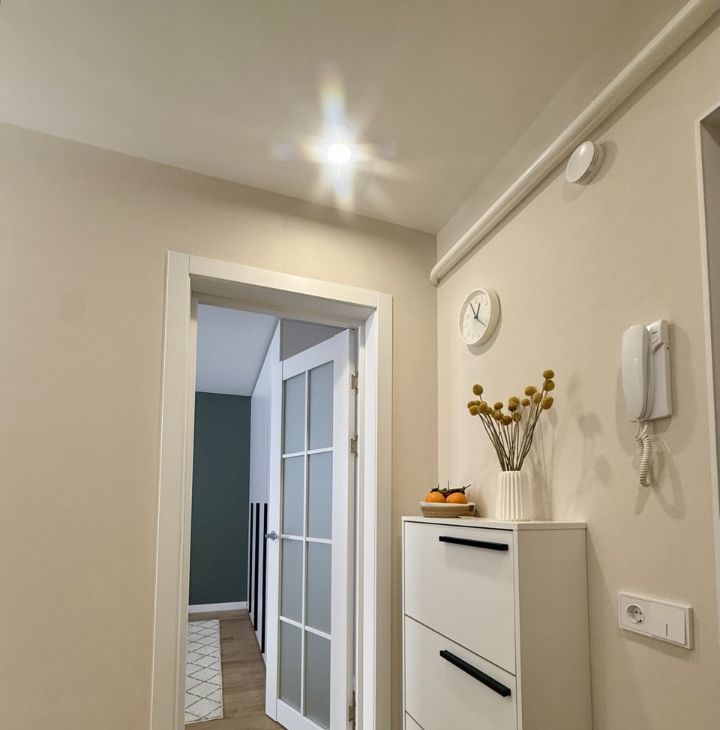 Дизайнерский ремонт в эко-стиле. Природные оттенки эвкалипта, беж/хаки в сочетании с деревом и легкими акцентами серебра. Установлены стильные белые межкомнатные двери.
