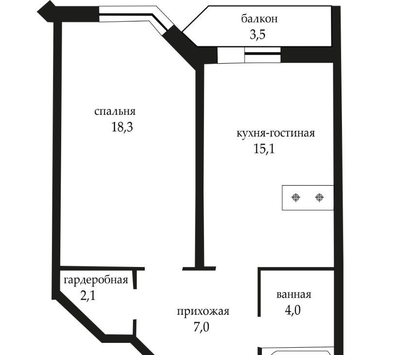 Просторная кухня-гостиная 15,1 м² - сердце квартиры для семейных вечеров. Выход на застеклённый балкон с панорамным остеклением.