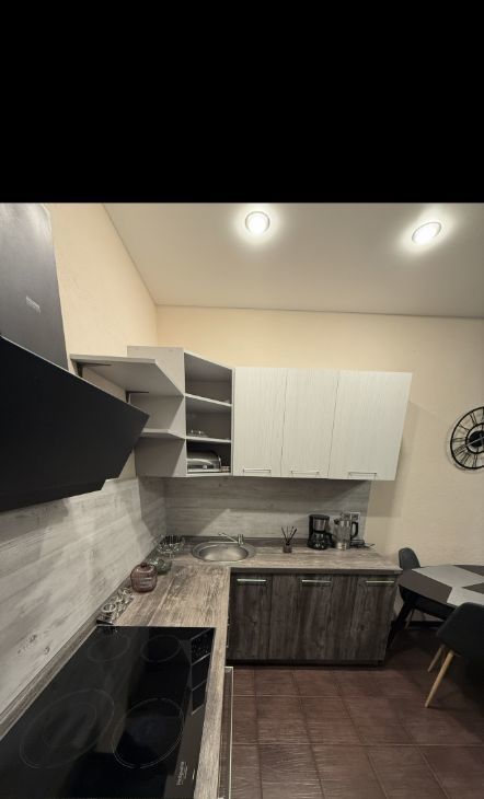 Кухня просторная, площадью 21 м²,Кухня Мария, оснащена современной техникой( духовой шкаф и варочная панель Электролюкс) включая холодильник и посудомоечную машину, чайник, кофеварка, гладильная доска, пылесос-2 штуки, фарфоровая посуда , столовые приборы , кастрюли и сковородки . В гостиной установлен телевизор и удобный диван( раскладывается в полноценное спальное место 2*2) Из мебели также имеются шкафы для хранения вещей.