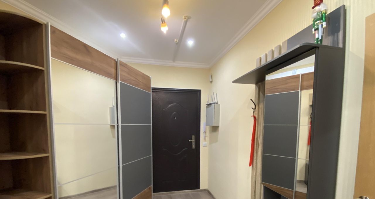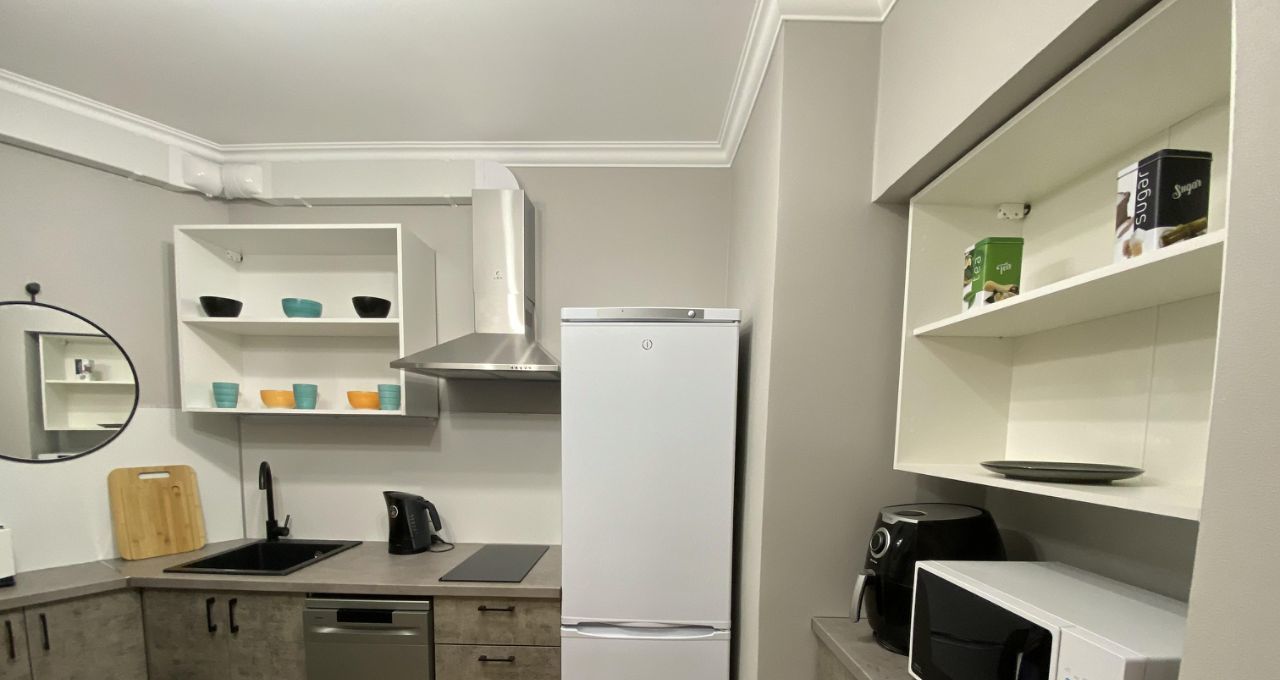 Квартира с ремонтом, оборудована стильной мебелью и техникой. Есть большой шкаф для хранения вещей, просторный диван, телевизор, стол круглый, стол письменный, стулья, стиральная машина, холодильник, посудомоечная машина, микроволновая печь, варочная панель, кухонный гарнитур, стол, стулья, на балконе шкаф для хранения.