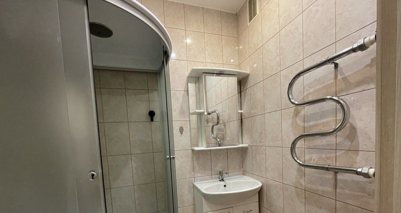 В санузле душевая кабина, тумба с зеркальным шкафчиком, полотенцесушитель из нержавеющей стали (водяной), стиральная машина Candy.