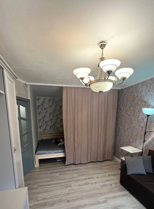 В квартире установлена дорогая техника и мебель. Практически все новое. Спальное место оборудовано в нише и может завешиваться, чтобы разграничить приватную и общую часть комнаты. Окна смотрят на небольшую парковку и деревья.
