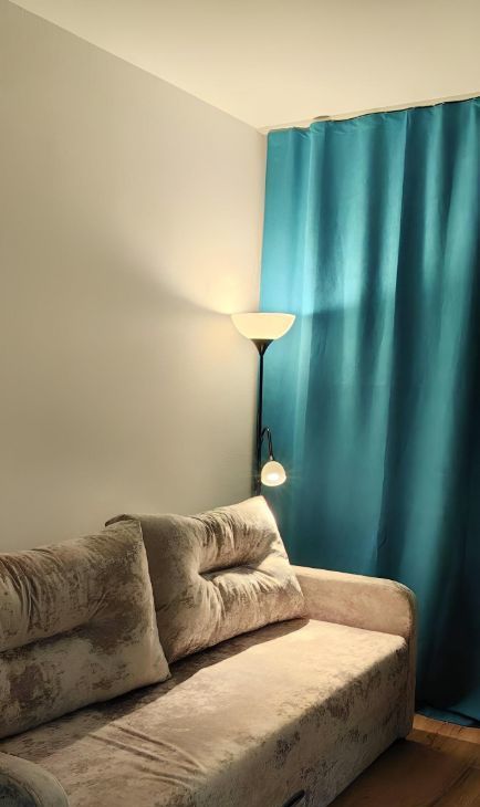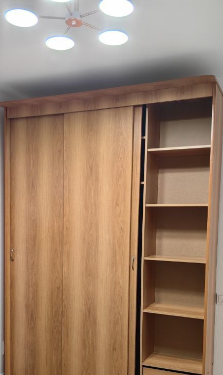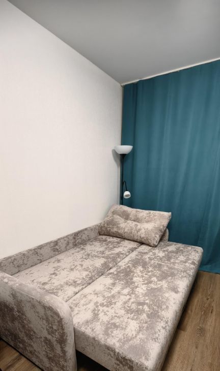В спальне расположен вместительный шкаф и диван с механизмом раскладки "аккордеон", в разложенном виде у дивана единый матрас, без стыков, что обеспечивает комфортный сон.